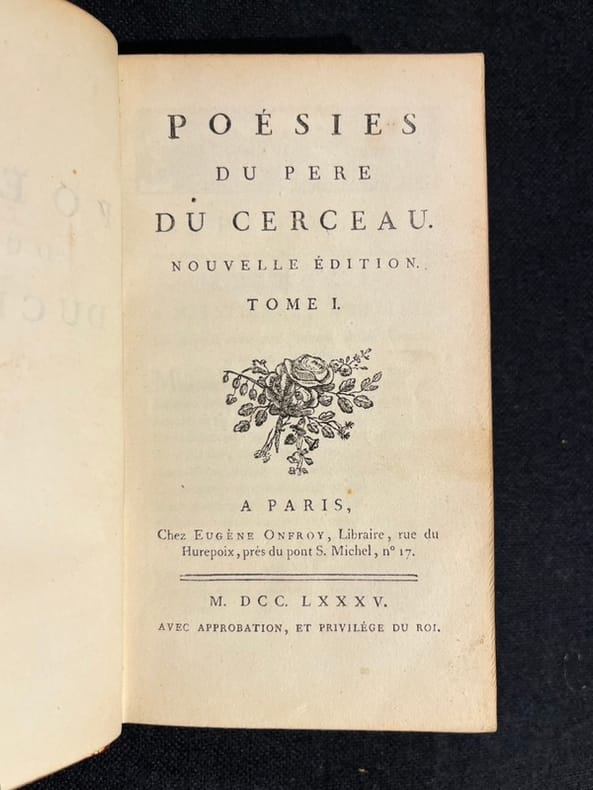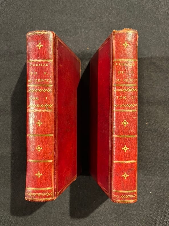 "Jolie édition" (Brunet) de ce recueil de poésies diverses, d'épîtres alertes et piquantes, de pièces critiques, de contes en vers, de fables et d'épigrammes et de pièces de théâtre de ce talentueux jésuite choisi pour précepteur du jeune prince de Conti, Louis-François. Outre les petites pièces de poésies fort spirituelles dont certaines font penser à Grécourt, Du Cerceau est l'auteur de trois pièces de théâtre (qui terminent ce recueil) qui avaient la particularité des pièces créées pour les collèges jésuites, de ne pas comporter de rôle féminin. L'une d'elles, L'Enfant prodigue, eut un succès constant jusqu'au milieu du XIXe s. Quérard II, 620; Brunet II, 867; Sommervogel II, 972.