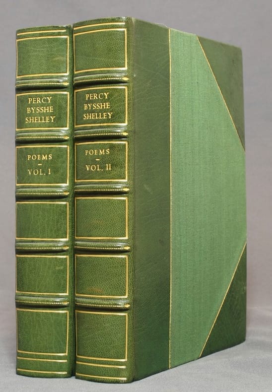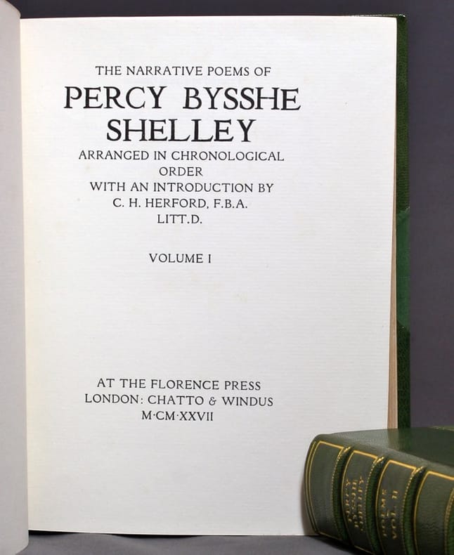 London, The Florence Press/Chatto & Windus, 1927. 2 volumes in-8 de V-352-[2] et V-301-[2] pages, demi-maroquin vert à coins, dos à 5 nerfs ornés de filets, roulettes, encadrements et titre dorés, filets dorés sur les plats, tranches dorées, gardes marbrées. Reliures signées Asprey & Co.
