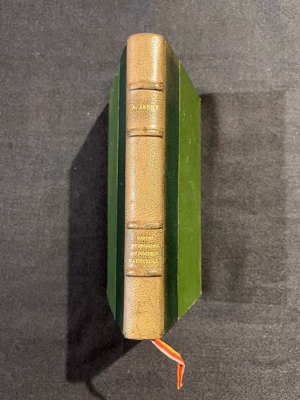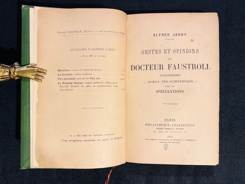 Edition originale sur papier d'édition après 5 rarissimes exemplaires sur Hollande. C'est ici qu'apparait pour la première fois la 'Pataphysique. Elle est alors définie comme la « science des solutions imaginaires qui accorde symboliquement aux linéaments les propriétés des objets décrits par leur virtualité » Livre I, chapitre VIII.