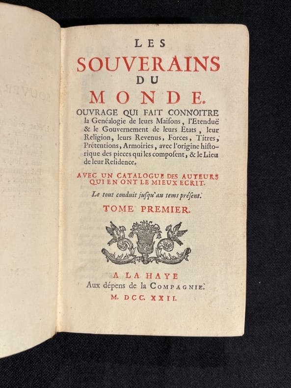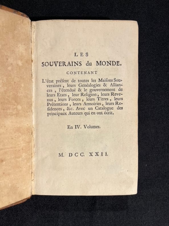 Outre les très belles armoiries gravées in-texte, l'exemplaire est bien complet des 45 planches hors texte (vol. I et III). Ouvrage important concernant la généalogie et l'héraldique. Traduit de l'allemand. Les deux premiers volumes concernant la noblesse allemande, le troisième volume la noblesse européenne et le quatrième volume les maisons royales non-européenne (Chine, Japon, Turquie, Afrique, etc) et se termine par les ordres de Chevalerie. Chaque notice est complétée d'une bibliographie. Ex-libris Horace de Landau et étiquette "Biblioteca Todaroana", nom de propriétaire inscrit à la plume. Le baron Horace de Landau, grand bibliophile, fut le fondé de pouvoir de James de Rothschild, et représenta la banque Rothschild à Turin au XIXe siècle. Barbier, IV-556.