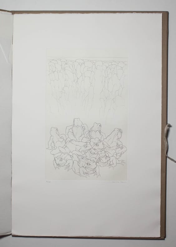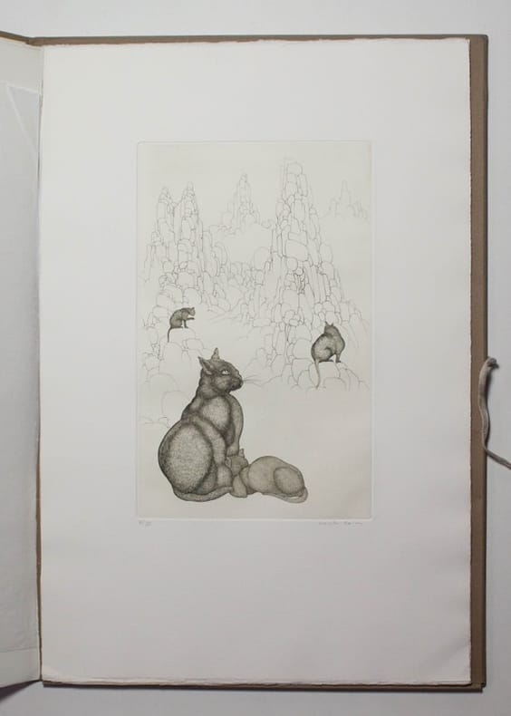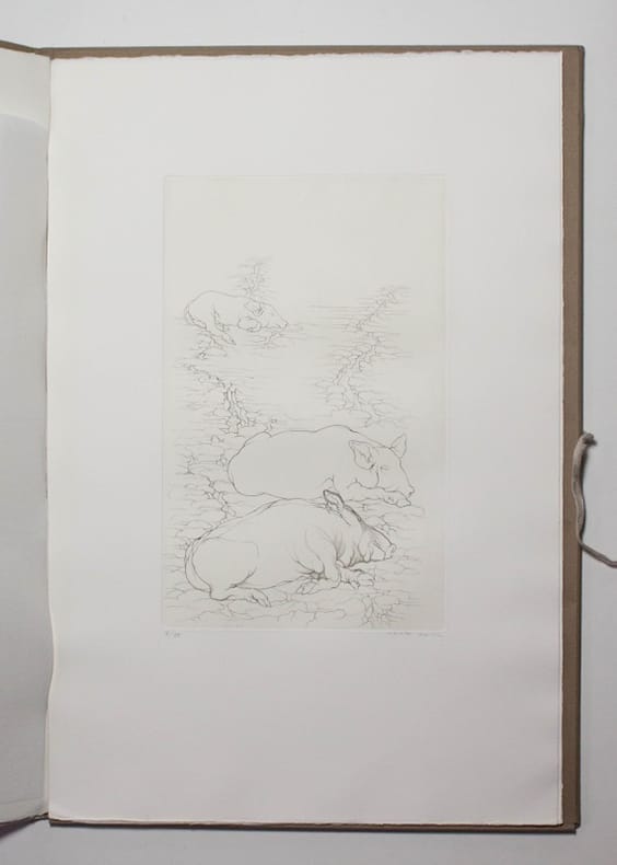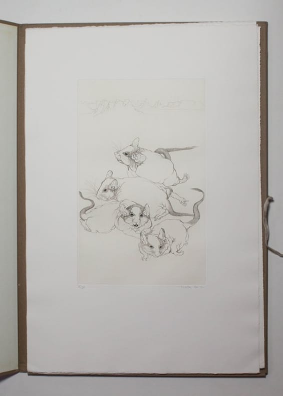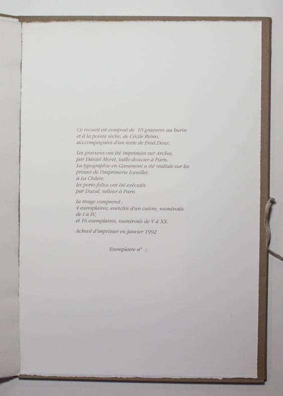 Illustré par Cécile Reims de 10 gravures au burin et à la pointe-sèche tirées sur Arches par Daniel Moret, taille-doucier à Paris, toutes justifiées et signées par l'artiste. Tiré à 20 exemplaires sur Arches (n° V). Texte liminaire de Fred Deux. La typographie en Garamond a été réalisée sur les presses de l'imprimerie Lœuillet à La Châtre.