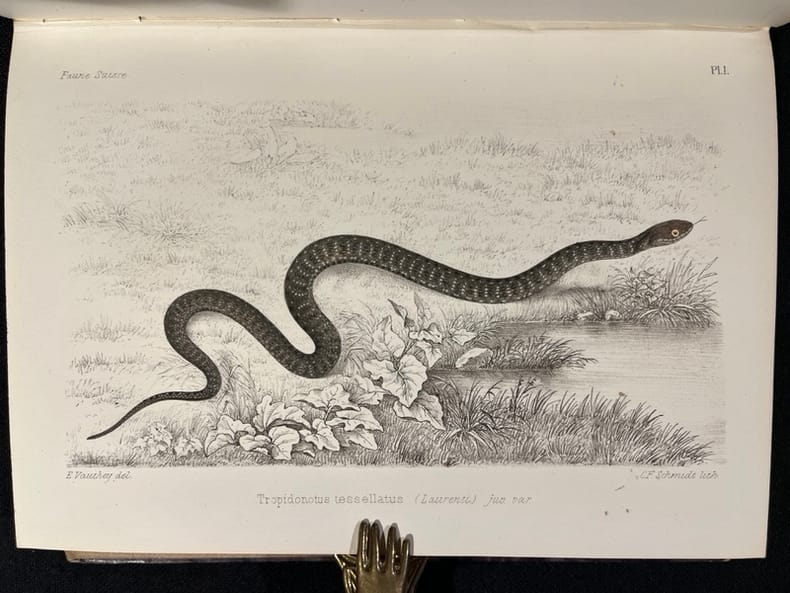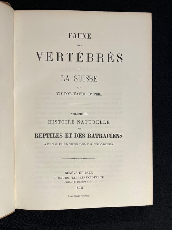 Illustré de 5 planches hors-texte dont 3 finement réhaussées à l'aquarelle. Edition originale. Il s'agit du troisième volume de l'ouvrage intitulé Faune des vertébrés de la Suisse, mais l'ouvrage est complet en lui-même. Nissen, Zoologische Buchillustration, 1332.