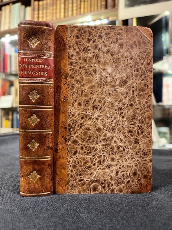 Edition originale de la traduction française. Celui que l'on surnomma le Vasari espagnol a rassemblé les biographies d'artistes des XVIe et XVIIe siècles, le Siècle d'or espagnol. L'ouvrage se termine avec deux tables alphabétiques, l'une des noms de peintre mais la seconde est pour les voyageurs curieux. On y a rangé par ordre alphabétique les villes, bourgs, châteaux & autres lieux sous lesquels le nom de chaque artiste dont on y voit les oeuvres […] Peu commun. Coins frottés, quelques épidermures, légère abrasure de la page de titre, le nom de l'auteur ayant été tracé au crayon bleu, puis gommé.