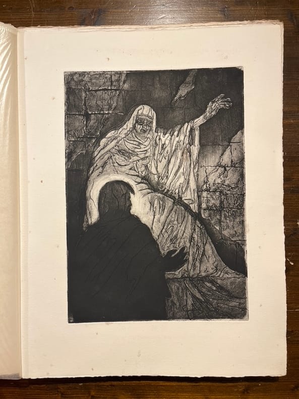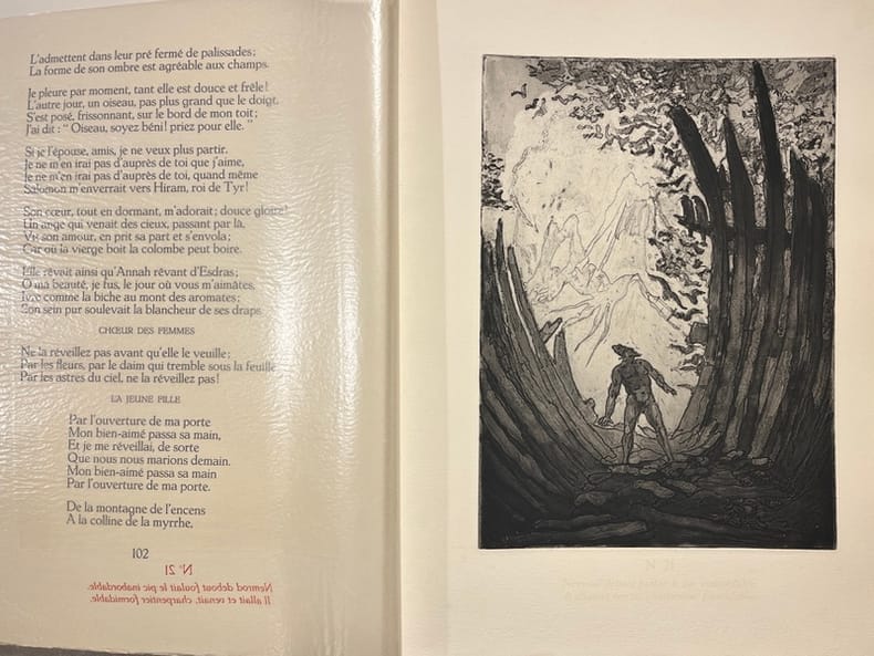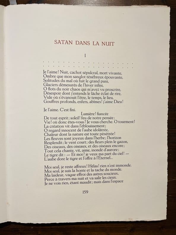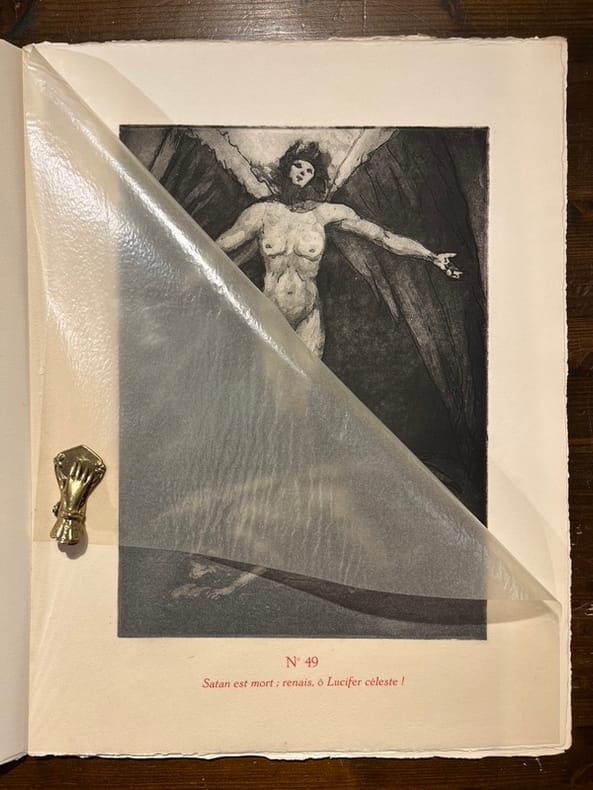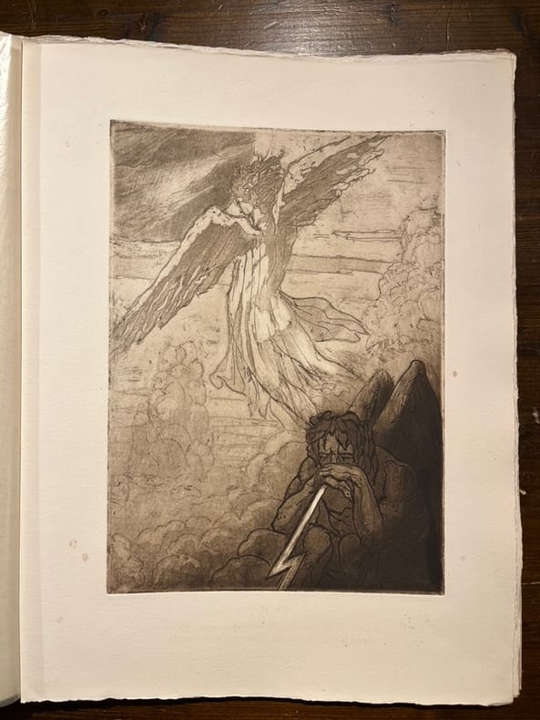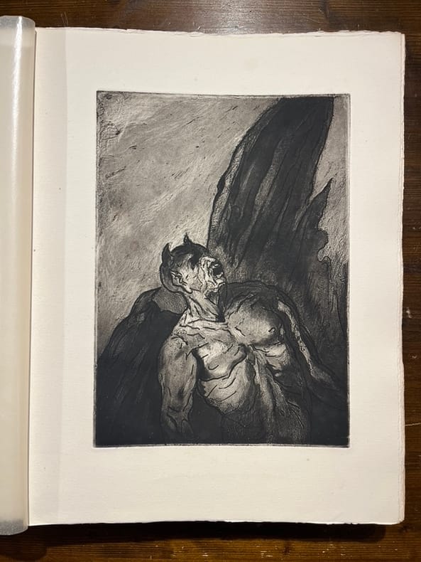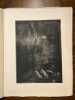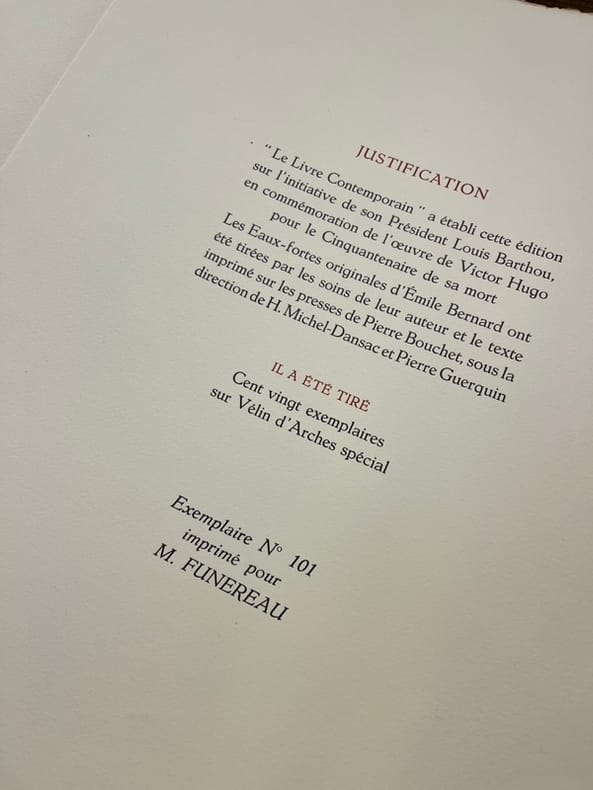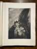 Illustré par Emile Bernard de 50 majestueuses eaux-fortes originales, tirées par l'artiste. Monumentale édition publiée sur l'initiative de Louis Barthou, alors président du "Livre Contemporain", à l'occasion du cinquantenaire de la mort de Victor Hugo. Tiré à 120 exemplaires numérotés sur vélin d'Arches spécial, celui-ci est le 101, imprimé pour M. Funereau. C'est Ambroise Vollard, qui avait déjà édité plusieurs livres illustrés par Emile Bernard, qui présenta ce dernier à Louis Barthou. Il invita l'artiste à lui proposer un texte à illustrer. Après le rejet de Dieu de Victor Hugo, premier choix du peintre, c'est La Fin de Satan qui fut retenu. "C’est cette angoisse de l’ombre que Bernard essaie de capter dans ses illustrations pour La Fin de Satan. Les eaux-fortes qui ponctuent l’édition monumentale du poème (le livre pèse sept kilos et mesure 85 x 50 cm.) rappellent le graphisme de Victor Hugo et d’Odilon Redon par leur caractère sublime et mystérieux." N. McWilliam, Emile Bernard. Au-delà de Pont-Aven, INHA, 2012. Quelques feuillets ont des rousseurs, et la chemise est abîmée, hormis cela c'est un très bel exemplaire.