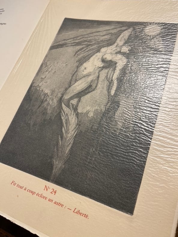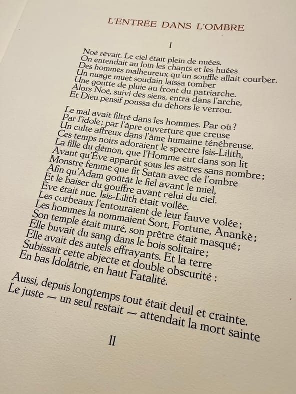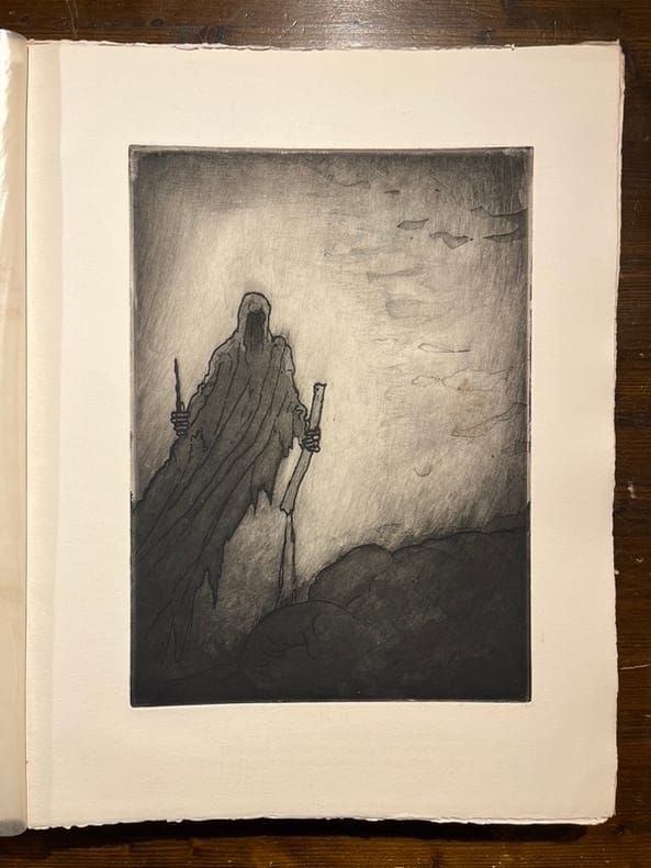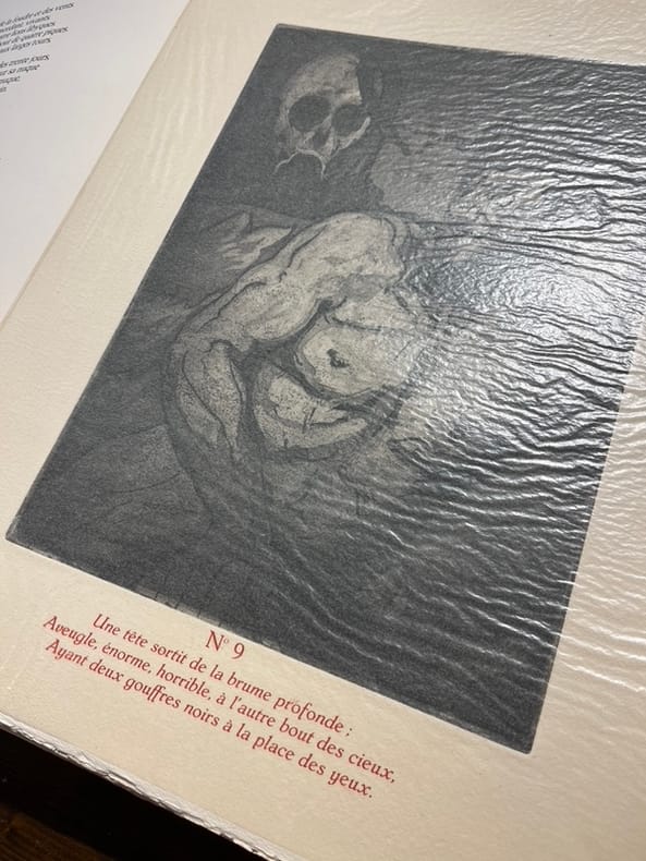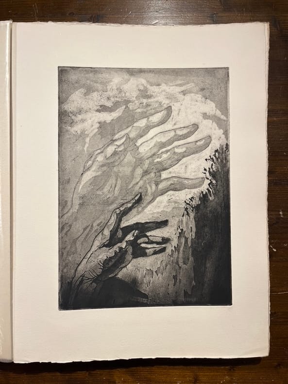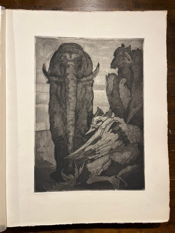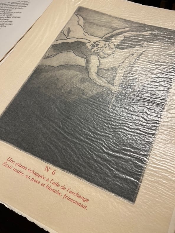 Illustré par Emile Bernard de 50 majestueuses eaux-fortes originales, tirées par l'artiste. Monumentale édition publiée sur l'initiative de Louis Barthou, alors président du "Livre Contemporain", à l'occasion du cinquantenaire de la mort de Victor Hugo. Tiré à 120 exemplaires numérotés sur vélin d'Arches spécial, celui-ci est le 101, imprimé pour M. Funereau. C'est Ambroise Vollard, qui avait déjà édité plusieurs livres illustrés par Emile Bernard, qui présenta ce dernier à Louis Barthou. Il invita l'artiste à lui proposer un texte à illustrer. Après le rejet de Dieu de Victor Hugo, premier choix du peintre, c'est La Fin de Satan qui fut retenu. "C’est cette angoisse de l’ombre que Bernard essaie de capter dans ses illustrations pour La Fin de Satan. Les eaux-fortes qui ponctuent l’édition monumentale du poème (le livre pèse sept kilos et mesure 85 x 50 cm.) rappellent le graphisme de Victor Hugo et d’Odilon Redon par leur caractère sublime et mystérieux." N. McWilliam, Emile Bernard. Au-delà de Pont-Aven, INHA, 2012. Quelques feuillets ont des rousseurs, et la chemise est abîmée, hormis cela c'est un très bel exemplaire.