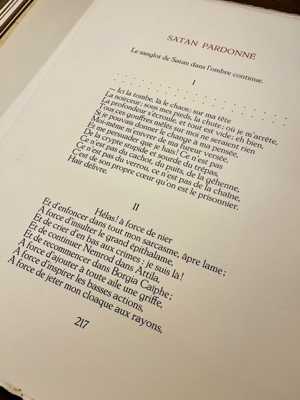 La Fin de Satan est un vaste poème épique et religieux de Victor Hugo (5700 vers). Après y avoir encore travaillé entre 1860 et 1862, Hugo n'y reviendra plus, et le poème sera publié de manière posthume en 1886. Au-delà de l'ambition générale manifestée dans la préface de La Légende des Siècles, La Fin de Satan possède une ambition particulière très étonnante : celle de mêler les âges et de relier la légende à l'histoire récente. Pour bibliophile, fin lettré, lecteur passionné.