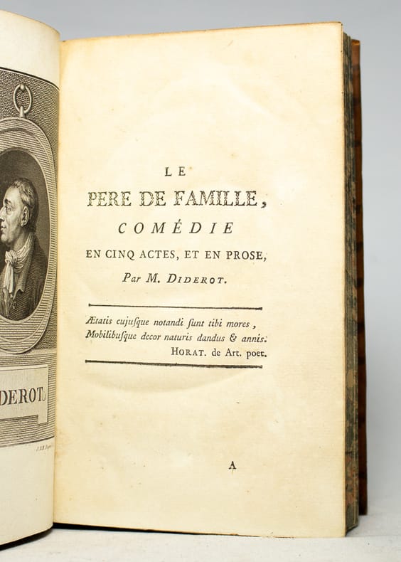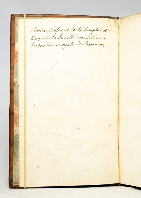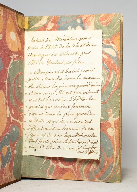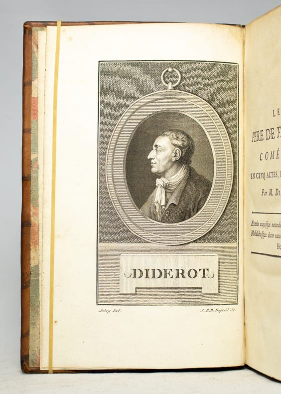 Orné d'un portrait de Diderot d'après Aubry par Dupréel. Notre volume correspond au troisième volume des Oeuvres Philosophiques de Mr. D***, le corps de l'ouvrage en a été extrait sans conserver les pages de faux-titre et de titre de cette édition qui fut probablement imprimée à son insu par Marc-Michel Rey (Adams). Feuillet manuscrit ajouté à la garde supérieure qui cite un passage des Mémoires pour servir à l'histoire et la vie de M. Diderot. Ex-libris manuscrit de Astiw (?), professeur de philosophie et doyen de la faculté des lettres de l'Académie royale de Besançon. Charmante condition pour cet ouvrage dans une reliure d'époque. Adams, I, A2.