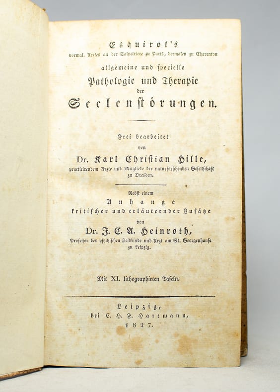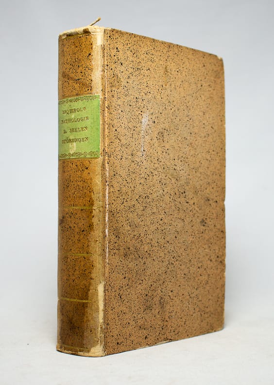 Orné de 11 planches dépliantes sur onglets par F. Milde et d'un tableau dépliant. Première édition allemande de ce texte important pour la psychiatrie moderne et notamment dans l'étude des types d'épilepsie pour lequel l'auteur distinguait l'intensité des crises en les nommant "le grand mal" et "le petit mal". Esquirol J.E.D. (1722-1840), psychiatre en poste à La Salpétrière, fut l'élève de Philippe Pinel avec qui il fonda l'école française de psychiatrie. Partageant un enseignement commun, Esquirol introduisit pour la première fois des méthodes statistiques dans la recherche psychiatrique tout en suivant les idées humanistes de son professeur. Rousseurs au texte et aux planches, quelques usures d'usages à la reliure (frottements). Ancienne étiquette de la librairie J.E.G. Müller à Berne. Précieux exemplaire provenant de la bibliothèque du docteur Paul Dubois, pionnier de la psychothérapie, avec son tampon gaufré. Heirs of Hippocrate, 1268.