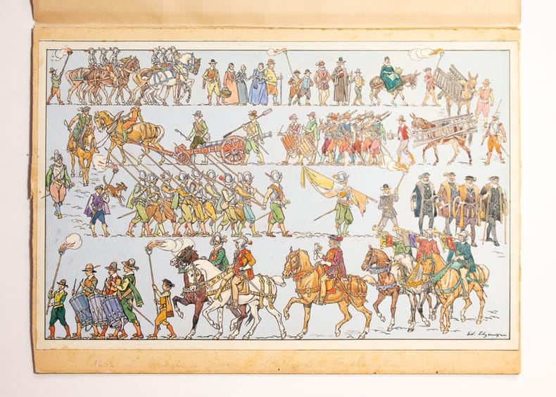 Charmante représentation du cortège de la Proclamation de 1602 qui s'étend, telle une bande-dessinée sur plusieurs plans offrant tout un panel de costumes au travers des groupes militaires ou civils qui se succèdent dont la Mère Royaume bravement juchée sur une mule accompagnée de sa marmite. De toute beauté.