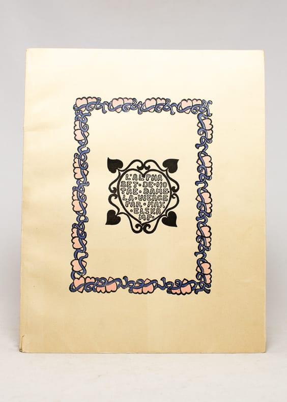 S.l.s.d. (Anvers, Edition du Conservatoire de la Tradition populaire, 1901), ''Achevé. d'orner dessiner. et graver. le 2. d'octobre 1901 par Max. Elskamp. Imagier. à Anvers et J.E. Buschmann imprima . In-4° . Broché à la Japonaise, couverture rempliée ornée en couleurs ( couverture très légèrement brunie), parfait état à l'intérieur. Tiré à 215 ex. num. 1/100 vergé anglais ( et non vélin comme indiqué à la justification), Quatrième papier après 5 sur Japon, 10 sur Chine et 100 sur Hollande. Les bois sont tirés en noir, mauve et rose. ( Voyez de Sadeleer, Catalogue raisonné n° 24 )..