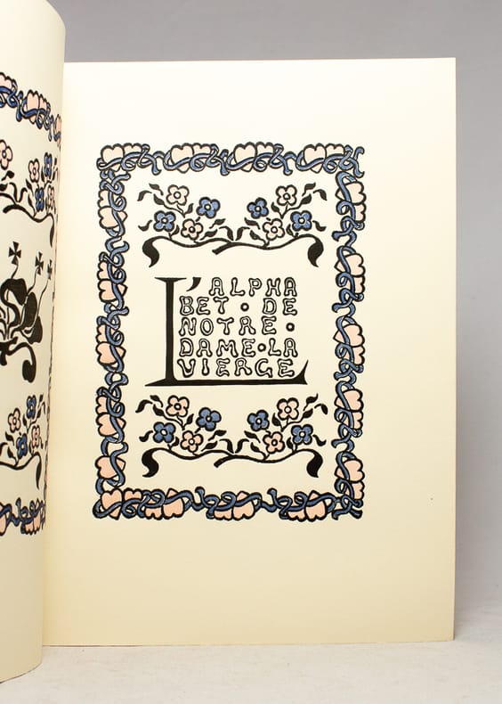 Édition du Conservatoire de la tradition populaire. Anvers Broché 1901 RARE. L’Alphabet de Notre-Dame la Vierge. Édition du Conservatoire de la tradition populaire. Anvers, 1901. In-4 (26,8 x 21,2 cm), broché, 29 feuillets doubles repliés sur eux-mêmes, couverture de papier vélin rempliée. Abécédaire entièrement orné, dessiné et gravé par le poète symboliste belge Max Elskamp (1862-1931). TIRAGE LIMITE à 215 exemplaires : 5 sur Japon, 10 sur Chine, 100 sur Hollande et 100 sur vélin. Le présent exemplaire est le n°184 sur vélin. Chaque page présente un encadrement de rubans bleus et coeurs roses, avec pour chaque lettre de l'alphabet le nom d'un symbole religieux, (Arche d'Alliance, Bâton du pèlerin, Consolatrice des affligés, etc.) dont l'initiale est placée au centre de la page, avec en regard un bois gravé illustrant ces symboles ; rares et pâles rousseurs, par ailleurs intérieur très frais, bel exemplaire. Livraison a domicile (La Poste) ou en Mondial Relay sur simple demande.