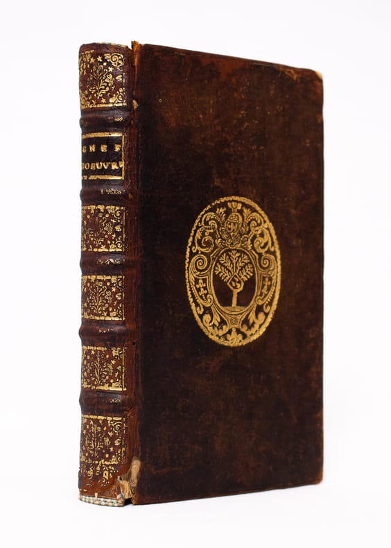 La Haye, chez Pierre Husson, 1744. "10 x 17, 52-528 (pagination continue)-32 pages, bandeaux, 2 gravures (2 portraits), 1 planche de musique dépliante, 1 autre planche dépliante, reliure d'époque plein cuir à 5 nerfs, dos : 1 pièce de titre, 5 caissons au décor floral, plats encadrés d'un triple filet, chants décorés, tranches rougies, pages de garde papier marbré, bon état (mors avant fendu sur 4 cm, coiffe légèrement abîmée; peu de rousseurs; ex-libris arraché)."