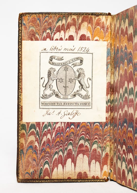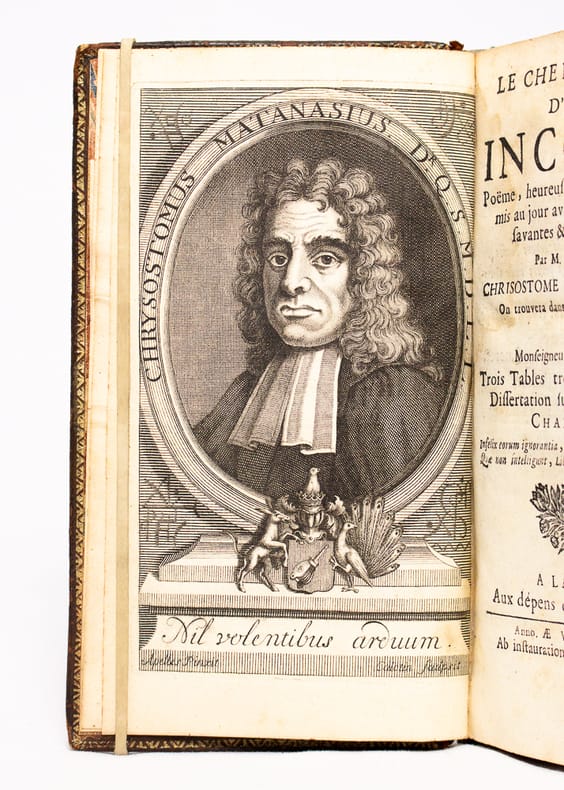Orné d'un portrait gravé de l'auteur en guise de frontispice d'après Apelles par Culctin et de bandeaux en bois gravé. Édition originale de ce texte satyrique dirigé contre l'érudition, le pédantisme et l'excès de savoir qui connut un vif succès lors de sa publication. La seconde partie reliée à la suite et annoncée dans le titre s'intitule Dissertation sur Homère et sur Chapelain est attribuée à Van Effen. Ex-libris Isaac Thellusson et celui daté et manuscrit A. Galiffe, banquier et adjoint à la commission des archives, il est l'auteur des Notices générales sur les familles genevoises depuis les premiers temps jusqu'à nos jours et ex-dono moderne à Horngacher Thelluson à l'encre bleu sur un ff. blanc.Exemplaire aux armes de Isaac Thellusson (1690-1755) importante figure politique genevoise issu du milieu bancaire, il travailla conjointement sur Paris avec son oncle Louis Guiguer et Jean-Claude Tourton et s'associa par la suite avec François Tronchin pour créer la banque François Tronchin et Cie qui ne subsista pas. Il entreprit une carrière politique au sein de la république de Genève en tant que ministre de la République de Genève auprès du roi de France et fut élu au Conseil des Soixante. Plaisant exemplaire à la provenance ancrée dans l'histoire genevoise. Quérard, II, 1073, d. Reliure frottée, coiffes manquantes, mors partiellement fendus. Mouillure à la marge centrale aux premiers feuillets, légères rousseurs et salissures.