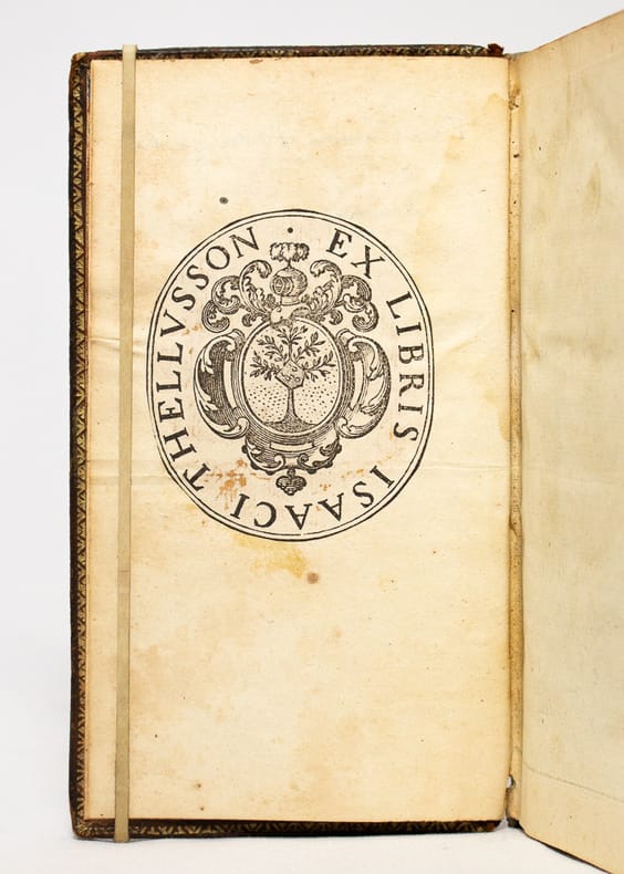 La Haye, Aux dépens de la compagnie, 1714. Deux parties en un petit in-8 de [50]-193 (noté 195); [2]-50-[16] pages, plein veau havane moucheté, dos à nerfs orné de fleuron et petits fers dorés, plats frappés des armes de Isaac Thellusson, roulette dorée aux coupes et aux chasses.