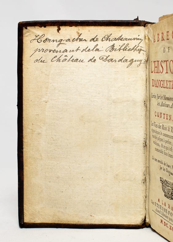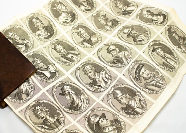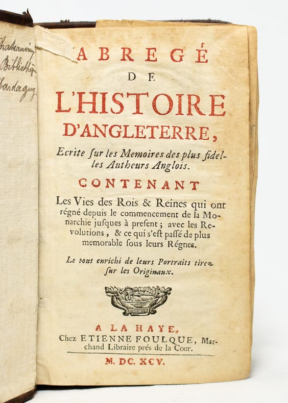Orné de 2 planches gravées comptabilisant à elles deux 48 portraits en médaillons de reines et rois d'Angleterre. Une troisième planche dépliante contient les titres des deux précédemment citées. Annotation manuscrite à la garde du plat supérieur "Horngacher de Châteauvieux provenant de la Bibliothèque du Château de Dardagny". Quelques rousseurs portant atteinte au texte. Épidermures.
