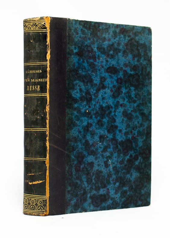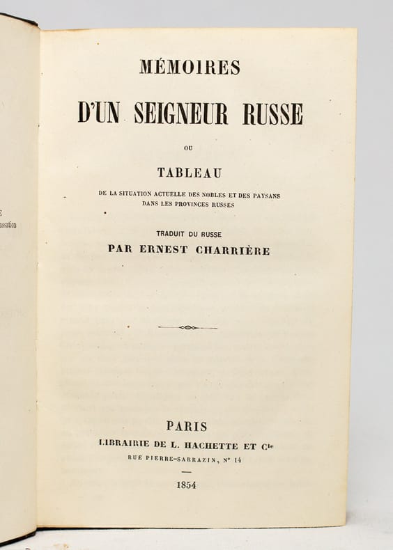 1854 2 titres rares concernant la Russie en un volume in12 reliure ancienne demi chagrin rouge,dos decoré,coiffe sup.abscente,initiales ESA en pied - couverture et le titre de l'ouvrage ,absents ici- Tourghenief (Tourgueneff) (Tourgueniev) Mémoires d'un Seigneur Russe ou Tableau de la situation actuelle des nobles et des paysans dans les provinces russes (« Récit d'un chasseur » ou « Mémoires d'un chasseur ») 1854. Traduit du russe par Ernest Charriere, Paris, Librairie de L. Hachette et cie, Bibliothèque des Chemins de Fer 4e série Littératures anciennes et étrangères , 1854, rare édition originale française de XII + 405 pages- Le titre de l'ouvrage évolue lors des éditions ultérieures : Récits d'un chasseur puis Mémoires d'un chasseur. À noter que le titre deviendra « Récit d'un chasseur » ou « Mémoires d'un chasseur ». [Attributes: First Edition;