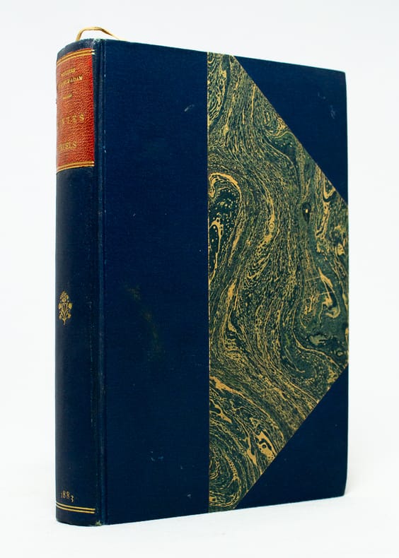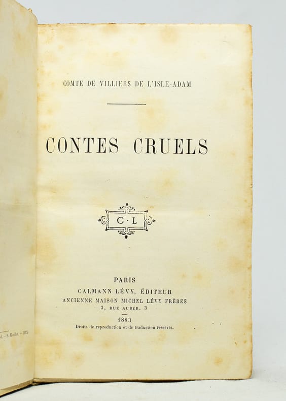 Édition originale. Nouveaux contes cruels est le dernier ouvrage paru du vivant de l'auteur. Il fait suite au recueil Contes cruels paru en 1883, qui demeure l'œuvre la plus célèbre de Villiers de L'Isle-Adam. Placées sous le signe de la cruauté, ces nouvelles sont souvent imprégnées d'éléments fantastiques. Ces Nouveaux Contes cruels, qui furent salués par Huysmans, ajoutent huit récits à cet ensemble. Un écrivain qui a inspiré le symbolisme. Villiers de L'Isle-Adam a joué un grand rôle dans la naissance du symbolisme français; il fut un grand admirateur de Poe et de Baudelaire, un passionné de Wagner et un grand ami de Mallarmé. Idéaliste impénitent, le rêve seul l'enchante et l'exalte, non sans s'accompagner d'une ironie sombre qui reste sa marque. Cette conception du rêve (et une grande part de sa philosophie), il la tient de ses connaissances sur l'œuvre d'Edgar Poe. En effet, par le rêve, Poe pensait pouvoir retrouver un état d'intégrité et de liberté intuitives. De la bibliothèque de l'écrivain François Heysh, avec son ex-libris illustré. Bon exemplaire en reliure de Vermorel, avec ses couvertures. Clouzot, Guide du bibliophile français. XIXe siècle, p. 277. Vicaire, Manuel de l'amateur de livres du XIXe siècle, VII, col. 1092.