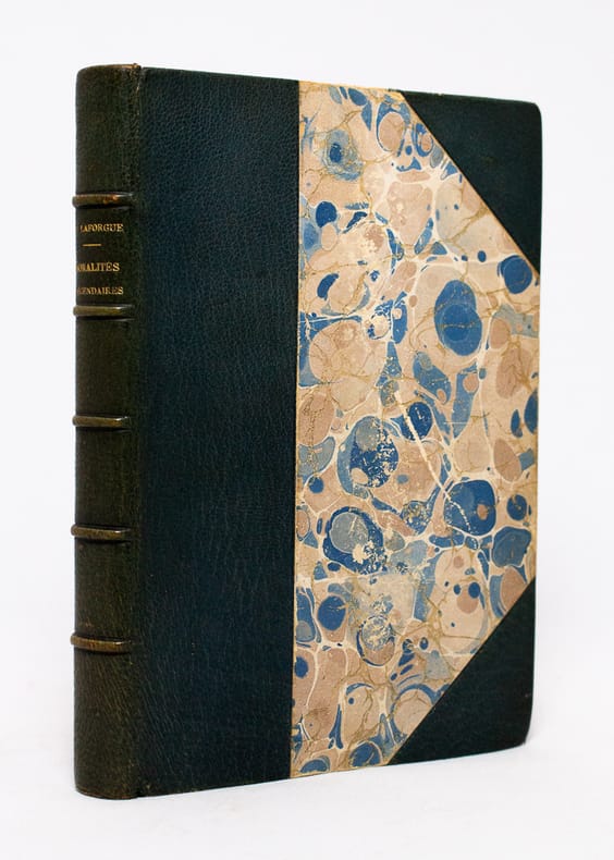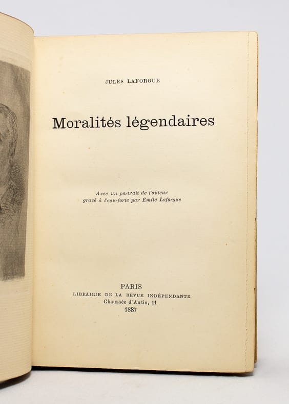 Paris, Librairie de la Revue Indépendante, 1887. 19,5 x 13 cm, 227 pp. Relié bradel plein tissus, dos lisse, titre doré sur le premier plat, couvertures conservées. Reliure poussiéreuse avec deux petits accrocs en haut et en bas du dos, sinon bon état. Édition originale, un des 400 exemplaires numérotés sur vélin anglais mécanique, seul tirage avec 20 grand vélin. En frontispice, un portrait de l'auteur à l'eau forte gravée par E. Laforgue. Accompagné d'une carte postale du libraire belge E. Deman à un ami avocat à Namur et sociétaire des Bibliophiles de Belgique, Joseph Nève, lui demandant de lui prêter cet exemplaire de la première édition des Moralités légendaires de Laforgue. Ex-libris de Joseph Nève sur le contreplat.