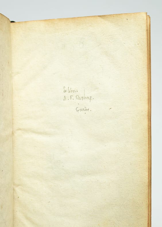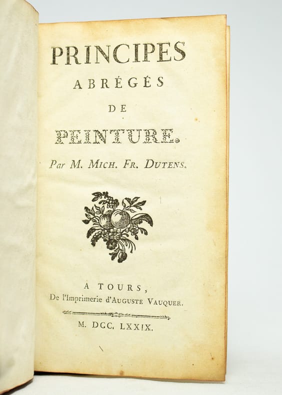 Orné de bandeaux et culs-de-lampe en bois gravé. Édition originale très rare de ce traité demeuré estimé qui se compose de diverses parties traitant à la fois de l'espace, l'anatomie humaine ou encore les couleurs et les pigments. L'auteur, Michel François Dutens, né à Tours, était un commerçant passionné de peinture. Ex-libris manuscrit à la mine de plomb A[ndré]. F[rançois]. Raphoz, membre de l'Ecole des Pâquis, groupe créé par Alexandre Cingria en 1924 et qui comptait en son sein Emilio Maria Beretta, Albert Chavaz, et Paul Monnier. Bonne condition générale malgré des coins émoussés. Quérard, II, 737.