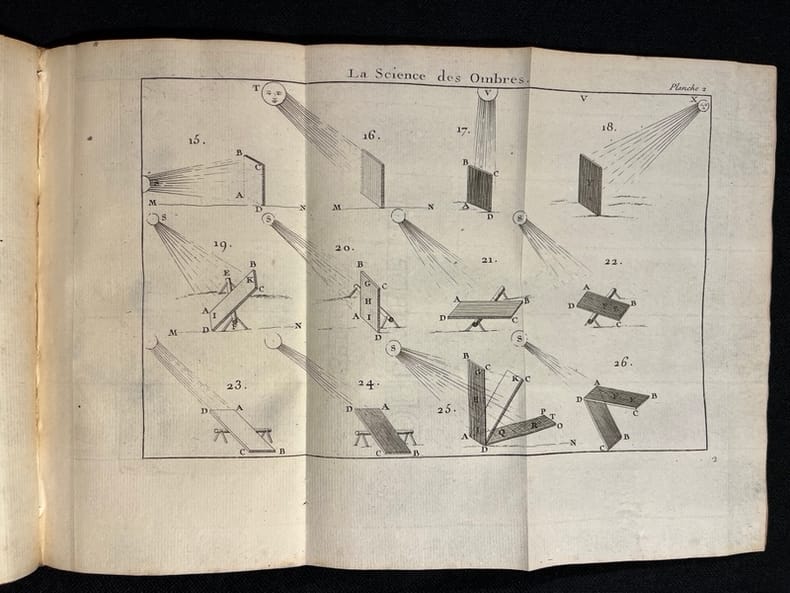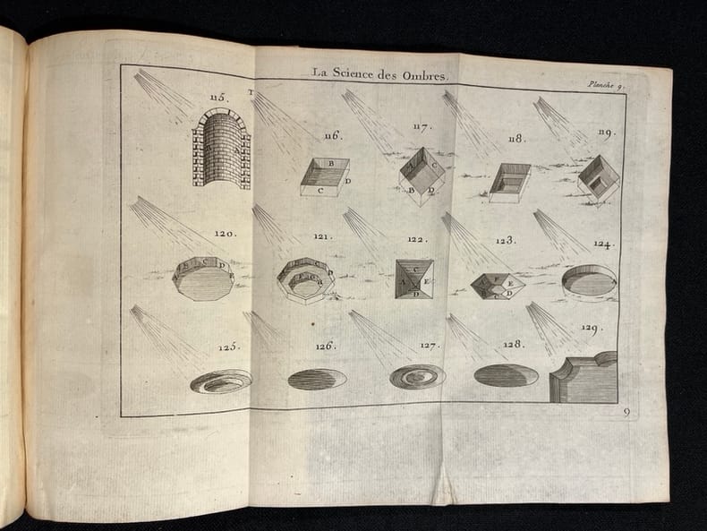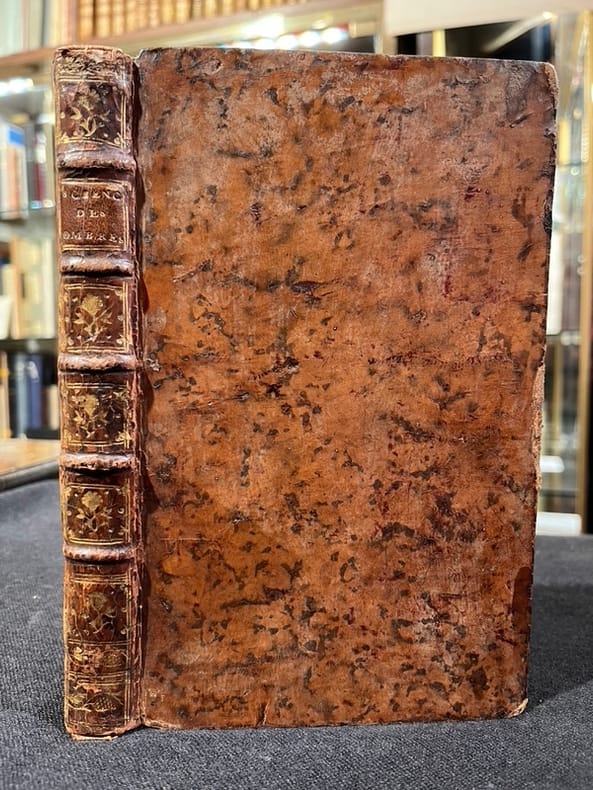 À Paris, chez Charles Antoine Jombert, 1760, in-8, 2 parties en 1 vol, pagination continue de XVI-92-[2]-III et 95 à 168-[4]-III pages, 18 planches, Veau havane de l'époque, dos à nerfs et fleuronné, pièce de titre brune, Nouvelle édition de cet ouvrage publié pour la première fois en 1750. Il comprend 18 planches gravées sur cuivre ; 14 illustrent, dans la première partie la manière de poser les ombres en fonction des formes et de la source lumineuse ; 4 montrent la manière de dessiner des plans de places fortifiées et des paysages alentours. Selon son auteur, cet ouvrage est destiné principalement "à ceux qui veulent dessiner l'architecture civile & militaire", à savoir les arpenteurs et les topographes ; c'est leur adresse que la seconde partie est consacrée. Le lieutenant Dupain de Montesson, né vers 1715 et mort dans les années 1790, était ingénieur topographe, ingénieur géographe et cartographe dans l'Armée. Sa contribution à l'art de la cartographie n'est pas négligeable ; on lui doit le relevé de nombreux plans dont ceux de la place de Courtrai, du cours du bas Rhin et des environs de Bayonne. Ex-libris manuscrit de Michel Javey au faux-titre et étiquette manuscrite au contreplat : "à M:el Javey de Baume. État intérieur assez moyen, avec quelques rousseurs et des salissures marginales et des petites déchirures sans manque à 2 planches ; une planche dépliante est rognée très court, avec perte marginale affectant légèrement l'illustration. Néanmoins, reliure plutôt bonne, en dépit d'une trace d'eau et d'un accroc léger sur le plat inférieur. Couverture rigide