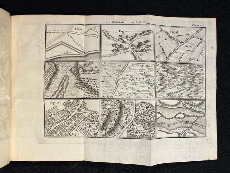In-8 (20,2 X 13,2 cm), deux parties en un volume, XVI-92 pp. + 14 planches dépliantes. A la suite : "Le Dessinateur au Cabinet et à l'armée", 74 pp. (de 93 à 168)+2ff. et 4 planches dépliantes. Ornements de texte : 3 bandeaux et 2 culs-de-lampe. Seconde édition, augmentée. "Dupain de Montesson (1720-1790) fut ingénieur topographe, on lui doit le relevé de nombreux plans dont ceux de la place de Courtrai, du cours du Bas-Rhin et des environs de Bayonne".