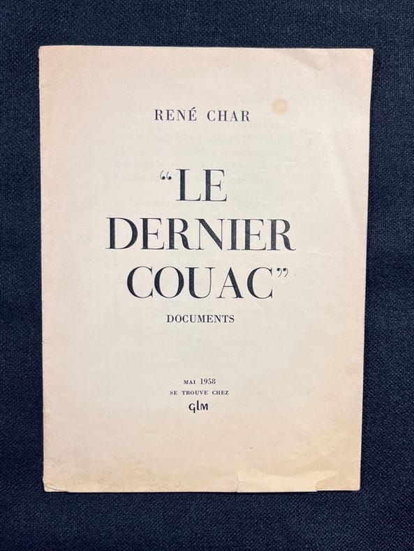 Paris : Guy Lévis Mano (GLM), mai 1958. Un volume agrafé ( 18,4x13,6 cm), (16) pages. Edition originale (tirage non précisé) sur vélin. Couverture légèrement jaunie aux angles sinon bon état.