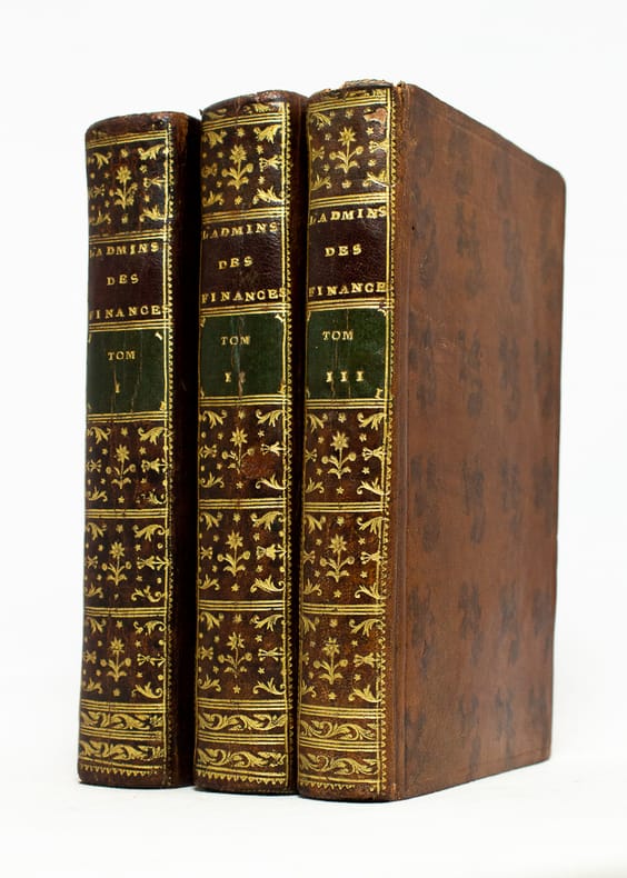 Sans lieu, sans nom d'éditeur, 1785, in-8°, iv-cxxxii-303 pp, un tableau remplié, reliure demi-veau moucheté, dos lisse avec pièce de titre (“Administration des finances”) et de tomaison basane vermillon et noire (rel. de l'époque), coiffe sup. abîmée, intérieur frais, bon état