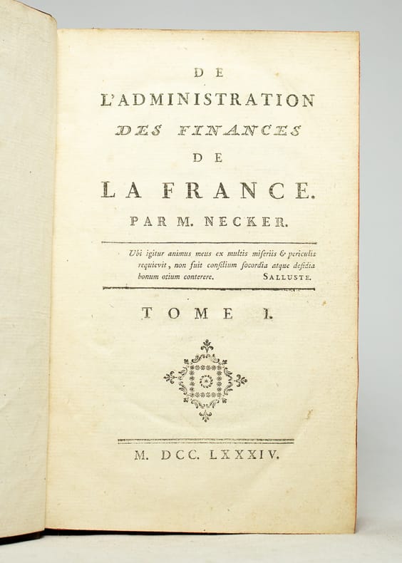 Tome I seul (sur 3) — Ouvrage majeur d'économie politique de Jacques Necker (1732-1804), alors ex-ministre des finances et ex-principal ministre d'État de Louis XVI. Après avoir été obligé de démissionner en 1781 de son poste de Contrôleur des Finances, ayant été discrédité auprès du Roi, Necker composa ce fameux traité qui devint dès sa parution un immense succès populaire. Ce livre, devenu classique en son genre, se vendit à 80.000 exemplaires en quelques jours. Il créa un choc dans l'opinion et fut à l'origine du premier exil de Necker. — "Critique indirecte des procédés déprédateurs de Calonne qui avait remplacé Necker au ministère, et qui achevait gaiement le désastre de la fortune publique, berçant une cour crédule de promesses et d'espérances auxquelles il était peu probable qu'il eut lui-même quelque foi" (Quérard, VI, 392)