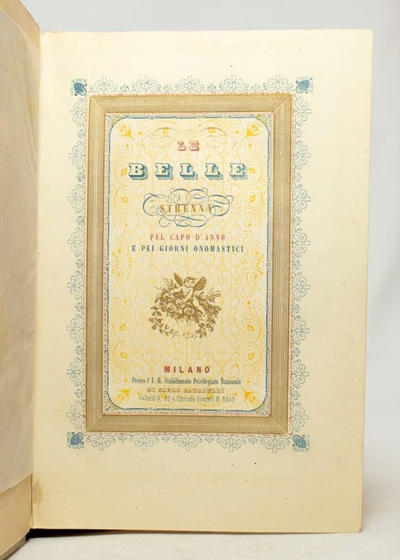 Orné d'une page de titre dorée et imprimée en trois coleurs avec un riche encadrement et de 6 figures hors-texte de portraits féminins en noir. Plaisant ouvrage dans une couverture romantique qui regroupe diverses histoires. Les 'strenna' sont des publications particulièrement élégantes faites à l'occasion d'une célébration particulière; notre exemplaire serait pour le jour de l'an et les fêtes chrétiennes. Ouvrage collectif, la liste des auteurs est présente en introduction du texte. Légères rousseurs à certaines planches; beau cartonnage avec hélas un petit choc au dos, le texte d'une remarquable fraîcheur.