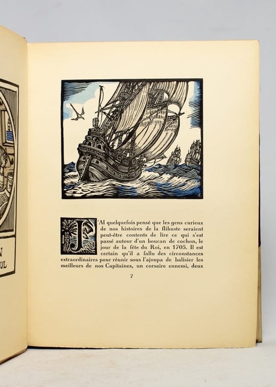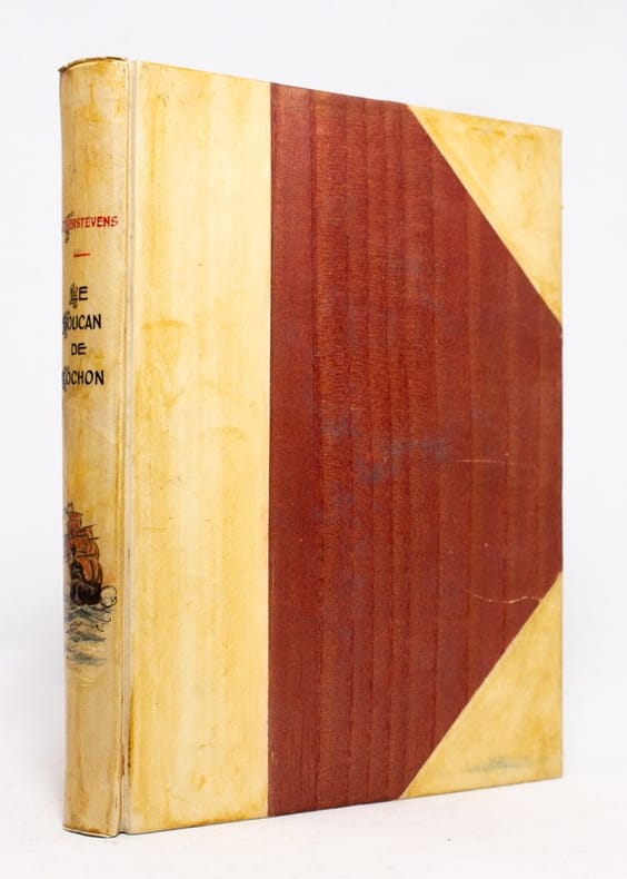 Paris, René Kieffer 1927 In-4, plein veau marine, dos lisse, reliure entièrement estampée à froid avec un grand décor à la plaque sur les plats représentant un navire et des palmiers, tête dorée, couvertures et dos illustrés conservés reliure de l'éditeur René Kieffer, 182 pp. 87 bois gravés en couleurs : frontispice, vignettes, lettres ornées et culs-de-lampe. Infime usure des coins sup., sinon bel exemplaire.