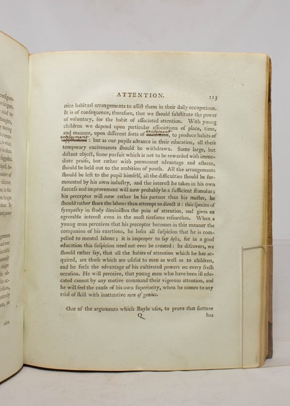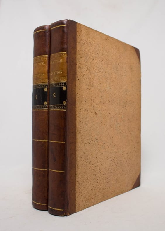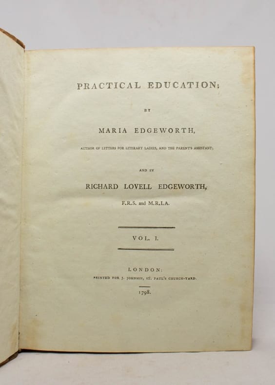 Orné de 3, dont 2 planches dépliantes à la fin du second volume. Édition originale. Maria Edgeworth fut une romancière et moraliste anglo-irlandaise qui connut une grande notoriété. Elle commence sa carrière en publiant des ouvrages sur l'éducation des enfants (elle s'occupe notamment de 13 de ses demi frères et soeurs...) et Practical education, co-écrit avec son père est un succès international (il est traduit en français par Charles Pictet en 1800). Elle met l'attention de l'enfant au centre de sa méthode d'enseignement. Maria Edgeworth fit de son approche de l'éducation une recherche qui fut patiemment réduite à une science expérimentale. Bien complet des feuillets d'errata dont les corrections ont été très proprement apportées dans le texte. De plus le premier volume est enrichi de nombreuses marginalia au crayon. C'est la même main qui écrit un petit avis au début du premier volume: " … c'est le plan qui a été [pour] l'éducation d'une famille, & les effets en ont été le bon sens & le bonheur. ".
