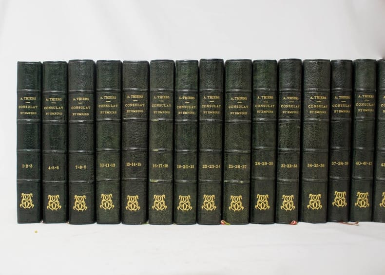 1 - la jeunesse de Bonaparte tbe- 2 - l'ascension de Bonaparte tbe- 3 - de brumaire à Marengo tbe- 4 le consulat tbe- 5 l'avenement de l'empire (scotch sur le dos haut et bas, 1er plat abimé- 6 vers l'empire d'occident état correct- 7 - l'affaire de l'Espagne bon état- 8 l'apogée de l'empire tbe- 9 la crise de l'empire bonétat- 10 - l'empire de Napoléon bon état- 11 - la nation sous l'Empereur bon état- 12 - la catastrophe de Russie bon état - 13 - l'écroulement du grand empire bon état - 14 - la campagne de france -petite usure sur le dos - 15 l'interrègen Impérial bon état - 16 - les cent-jours, Waterloo bon état (220euros) MANQUE TOME XI-TOME XIV ET TOME XV.