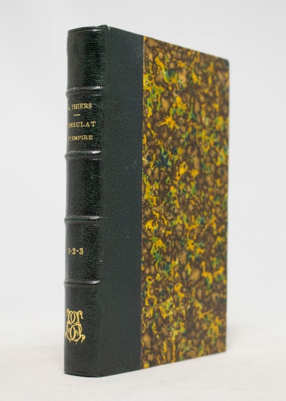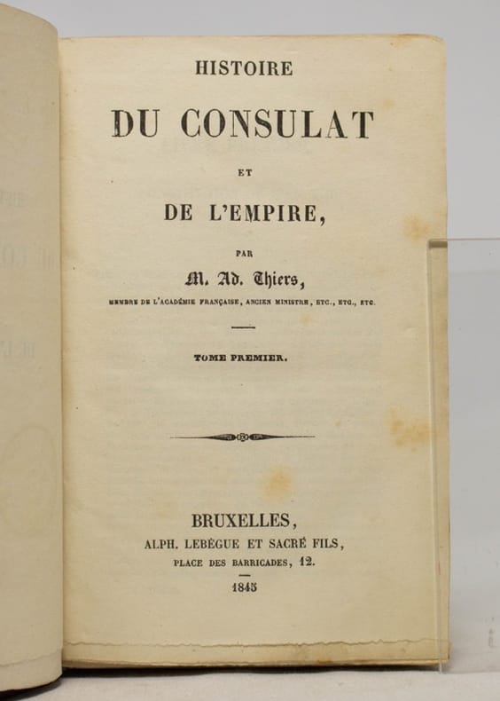 Tome 1: constitution de l'an VIII, administration intérieure, Ulm et Gènes, Marengo - Gravures:portraits de A. Thiers, Bonaparte, Masséna, Bonaparte traverse le Saint Bernard, portrait de Dessaix; Tome 2: héliopolis, Armistice, Hohenlinden, Machine infernale, les neutres - gravures: Kléber à Héliopolis, Talleyrand, Joséphine, Bataille de Hohenlinden, Mort tragique de Paul 1er; Tome 3: évacuation de l'Egypte, Paix générale, Concordat, Le tribunat, consulat à vie - Gravures: Duroc, Beau fait d'armes du capitaine Troude, Pie VII, Revue à lyon de l'armée d'Egypte; Tome 4: les sécularisations, rupture de la paix d'Amiens, camp de Boulogne, conspiration de Georges - Gravures: St. Domingue, Bruix, Combat sur la plage de Boulogne, débarquement de Georges à la falaise de Biville; Tome 5: l'Empire, le sacre, troisieme coalition -gravures: Berthier, Napoléon proclamé empereur (planche double), Fete au camp de Boulogne, Napoléon essuyant le feu d'une frégate anglaise, Napoléon; Tome 6: Gravures: Murat, Trafalgar, le maréchal Mortier au combat de Dirnstein, surprise des points de Vienne, bataille d'Austerlitz, la princesse Pauline Borghese; Tome 7: Gravures: bataille d'Iéna, le maréchal Davout, charge des cuirassiers à Eylau, siege de Dantzig, Oudinat à Friedland...Atlas, dessiné et dressé sous la direction de M. Thiers, par MM. A. Dufour et Duvotenay, gravé sur acier par Dyonne, éditeur Lheureux, 1864. Quelques cartes: Souabe, Suisse, Piémont, vallée du Danube...chaine des Alpes...champ de bataille d'Eylau, de Dantzig, de Friedland, environs de Vienne, places fortes d'Espagne, de la Russie d'Europe, de la route de Wilna à Moscou, de Laon, de la bataille de waterloo.... Classification Dewey : 944.05-Premier Empire, 1804-1815