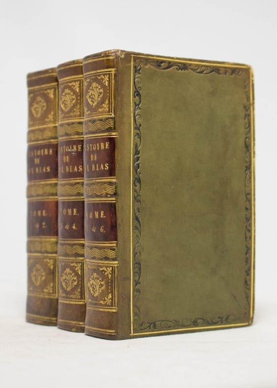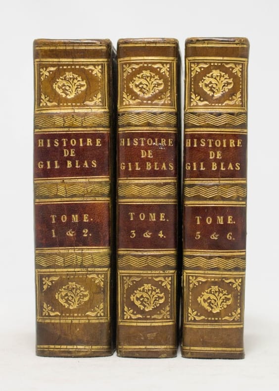 Paris, Lefèvre, 1825 ; petit in-4, XXIV pp. + 386 pp. + 456 pp. + 386 pp., reliure demi-veau brun, dos orné à nerfs, pièces de titre noir (faiblesse à la 1ère coiffe). Les 3 volumes. Alain-René Le Sage commença par étudier la philosophie et le droit à Paris. Il s'essaya ensuite à la traduction du latin et de l'espagnol, mais ne rencontra le succès qu'avec "le Diable boiteux" et son "Gil Blas", pastiches picaresques, inspiré donc du roman espagnol. Il s'essaya également au théâtre. Notes du comte François de Neufchateau. Un frontispice et 1 carte dépliante. Bon état.