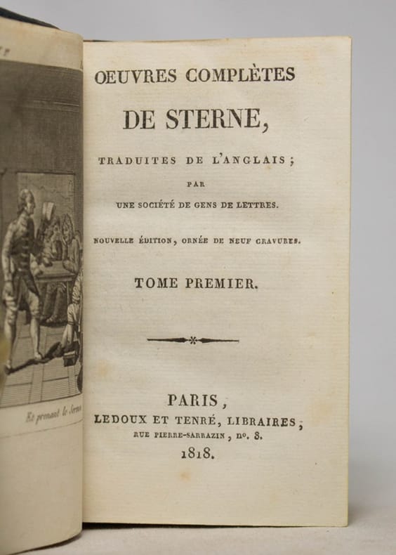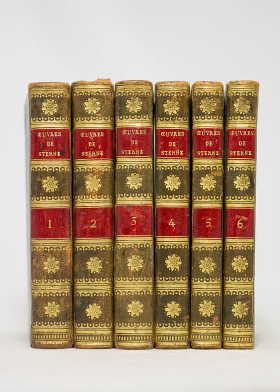 Paris, Ledoux et Tenré, Libraires, 1818, 6 vols in-12°, 13,5 x 8,5 cm, with 9 full-page engravings (of which one portrait of the author), bound in uniform red half roan with a double green label on the smooth gilt decorated spine, edges painted yellow, some minor foxing spots, some light shelve marks but still a fine set. (Les oeuvres complètes de Sterne joliment reliées dans une série de 6 vols en demi-basane rouge).