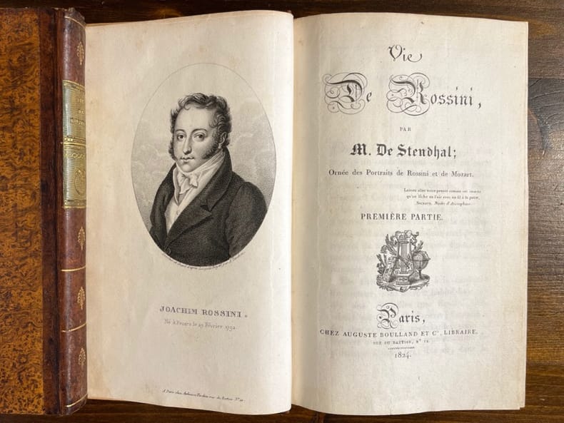 Illustré de 2 beaux portraits pour chacune des parties: celui de Rossini dessiné et gravé d'après Léopold Beyer, gravé par A. Tardieu, en premier et de Mozart pour la seconde partie. Édition originale, ici en reliure fin XIXème. Quelques rousseurs, coupes frottées. Cordier, Bibliographie stendhalienne, n° 64.