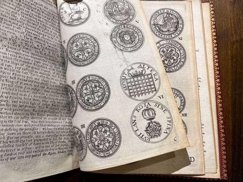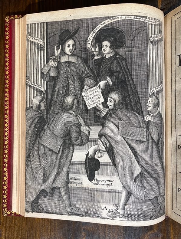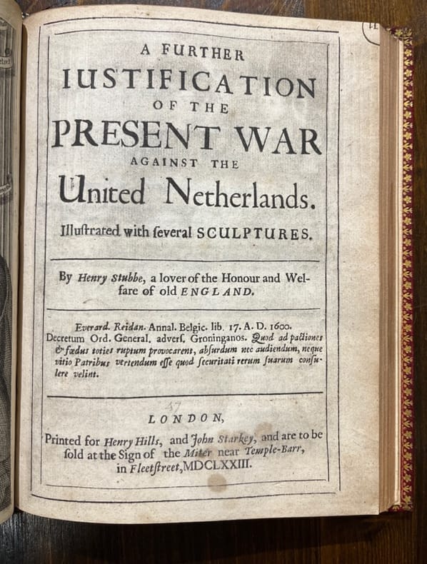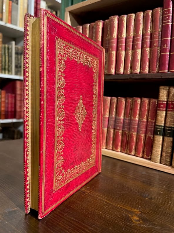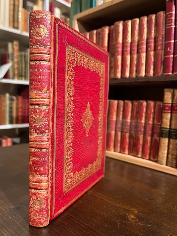 London, Henry Hills and John Starkey, 1672 [et] 1673. In-4 de [8]-80 pages (A-L4 ) [et] [24]- de 1 à 88 (chiffrée par erreur 86); de 57 à 136 soit [24]-168 pages (A-C4; A-G4; (*)4; (**)4; (***)4; (****)4; H-R4). Plein maroquin rouge à grains longs, dos à nerfs orné de filets et fleurons dorés, larges filets et fleurons encadrants les plats, tranches dorées.