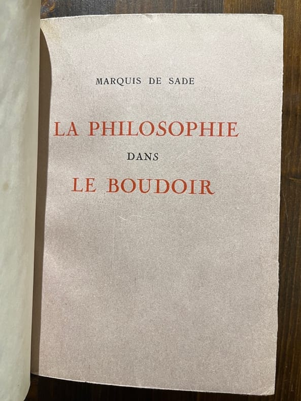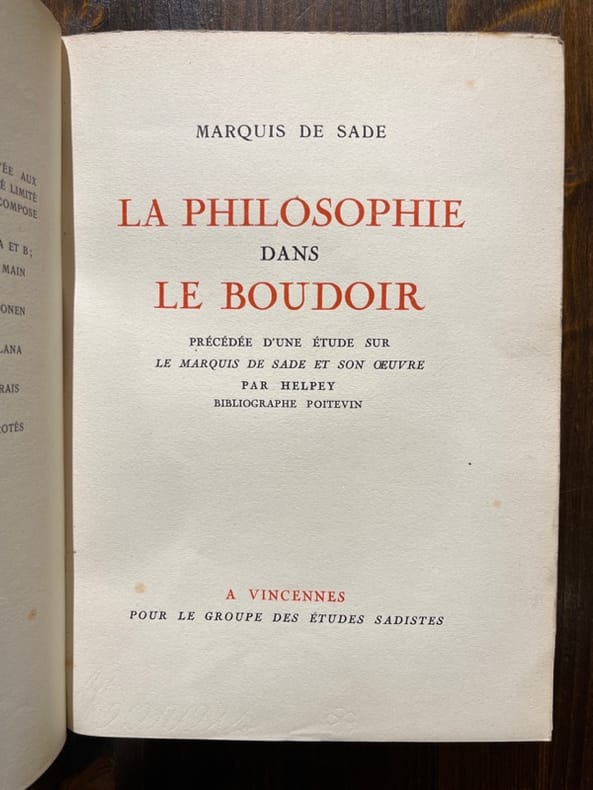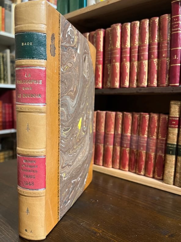 A Vincennes, pour le groupe d'études sadistes, sans date [ 1948]. In-4 de [4]-246-[4] pages, demi-veau beige, dos à nerfs orné de filets et fleurons dorés, pièces de titres rouge et noir, roulette dorée sur les plats; premier plat de couverture conservé, non rogné.