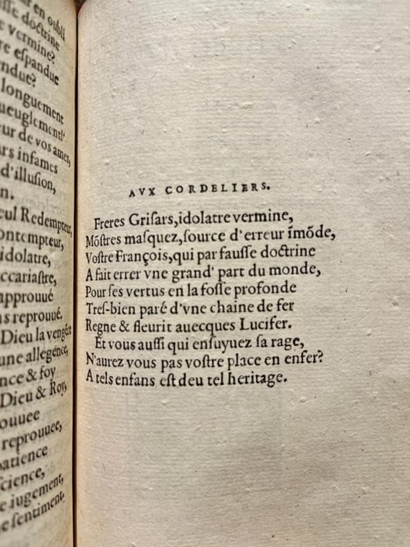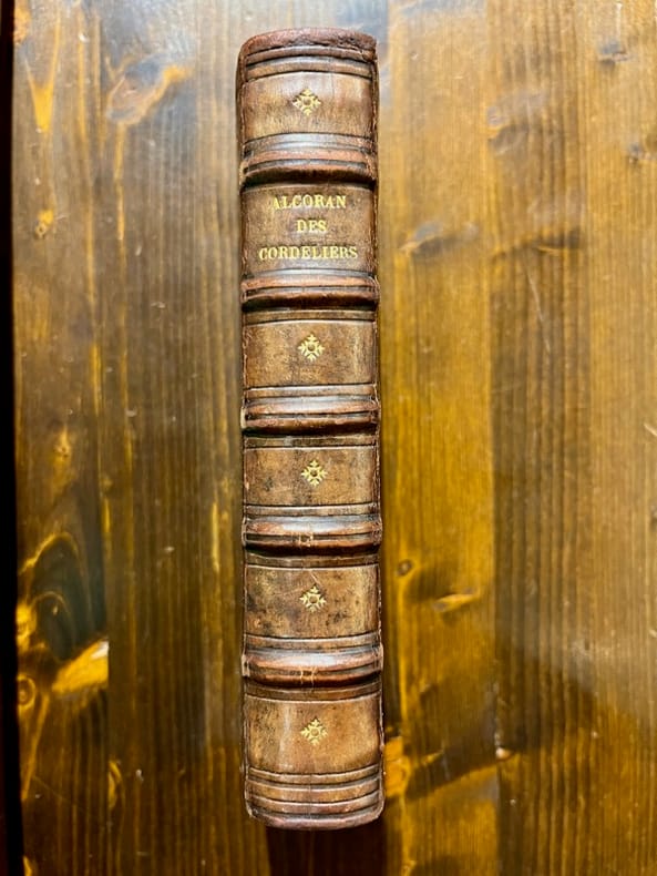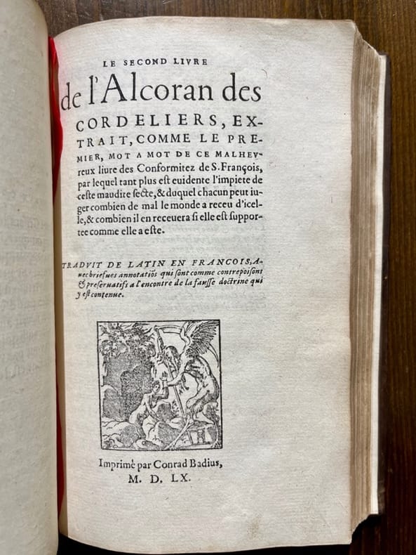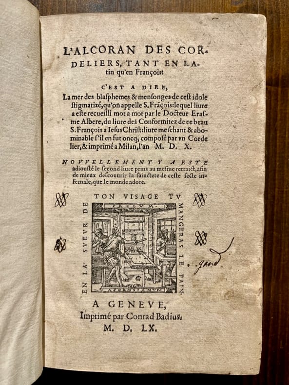 Chacune des pages de titre est illustré d'une marque d'imprimeur différente: marque à la presse typographique «Prelum ascensianum» pour la première partie; marque avec le Temps tirant la vérité d'une grotte pour la seconde partie. Heitz, Genfer, n° 8et n°7. Première traduction complète. Erasmus Alberus, humaniste, réformateur et poète allemand, fut un assistant fort actif de Martin Luther qui signe ici la préface (en latin et en français). Alberus rédige une satire en prose du Liber confermitatum du franciscain Bartolommeo Albizzi de Pise dans lequel l'ordre franciscain est tourné en ridicule. Conrad Badius a également trempé sa plume dans le vitriole pour signer sa préface et la seconde partie qui paraît ici en édition originale dont voici le titre en entier: "Le second livre de l'Alcoran des Cordeliers, extrait, comme le premier, mot a mot de malheureux liuvre des Conformitez de S. François, par lequel tant plus est evidente l'impieté de ceste maudite secte, et duquel chacun peut juger combien de mal le monde a receue d'icelle, et combien il en recevera si elle supportée comme elle a esté. Traduit de latin en francois, avec briefves annotations qui sont comme contrepoisons et preseruvatifs a l'encontre de la fausee doctrine qui y est contenue."Qu'on se le dise.Brunet, I, 151; Haag, I, 682; Cat. Stroehlin, n°2236; Chaix, Dufour, Moeckli, p. 41; Le livre à Genève, 37, pour la première édition (1556); GLN 2131 et 7156.