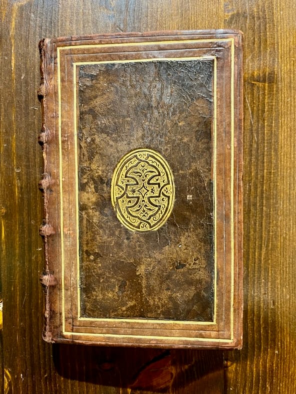 A Genève, imprimé par Conrad Badius, 1560. 2 parties en un volume in-8 de 8-278-[2] et [16]-303-[1] pages [A4; a-r8; s4; *8; A-T8]. Reliure 19ème en plein veau brun, dos à nerfs orné de petits fleurons dorés. Les plats sont constitués du cuir de la reliure originale, ornés au centre d'une large pastille dorée, décorée d'arabesque; encadrés de double filets dorés et à froid, Tranches dorées.