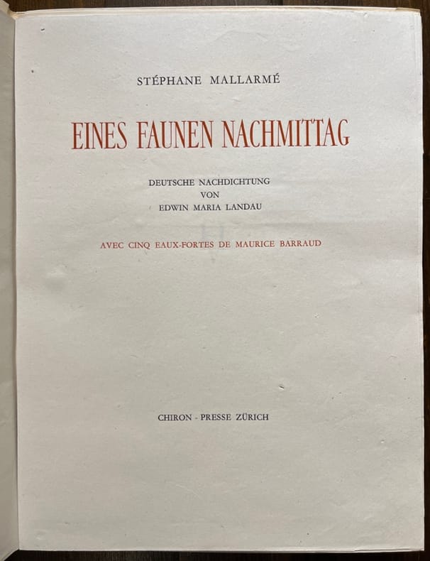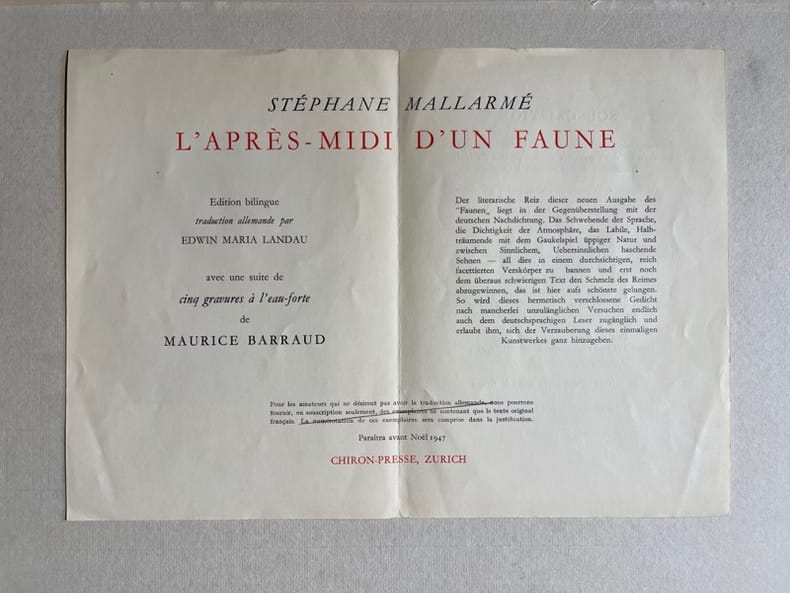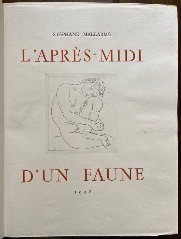Paris Rombaldi 1943-1944 Ensemble 5 volumes in-4, en feuilles, couvertures illustrées (emboîtages de l'éditeur).Edition originale pour Un faune et Le Réveil du Faune (poèmes inachevés formant la suite et la conclusion scéniques du premier Faune composé pour la Comédie-Française). Ces ouvrages sont illustrés de 93 lithographies originales en noir par René Demeurisse. Tirage limité à 220 exemplaires numérotés pour les quatre premiers volumes et à 140 exemplaires numérotés pour Le Réveil du Faune. Pour les quatre premiers volumes: exemplaires hors commerce sur vélin de Lana, imprimés au nom du libraire éditeur Marcel Sautier, enrichis d'une suite à part en noir des lithographies sur vélin de Lana; pour le cinquième volume: un des 110 exemplaires sur vélin pur fil de Lana.