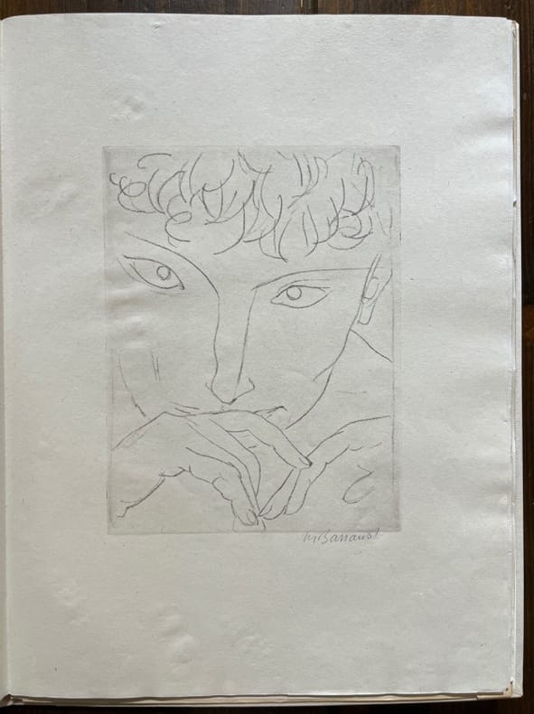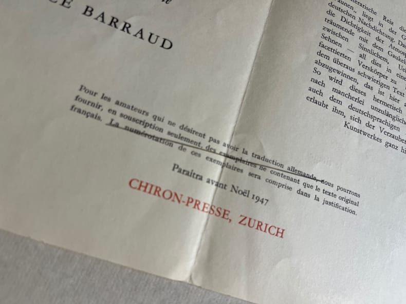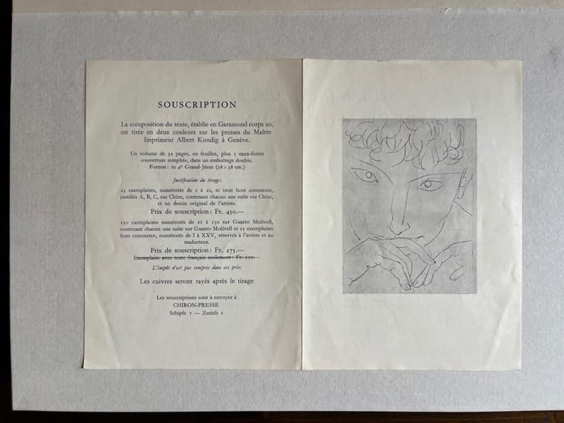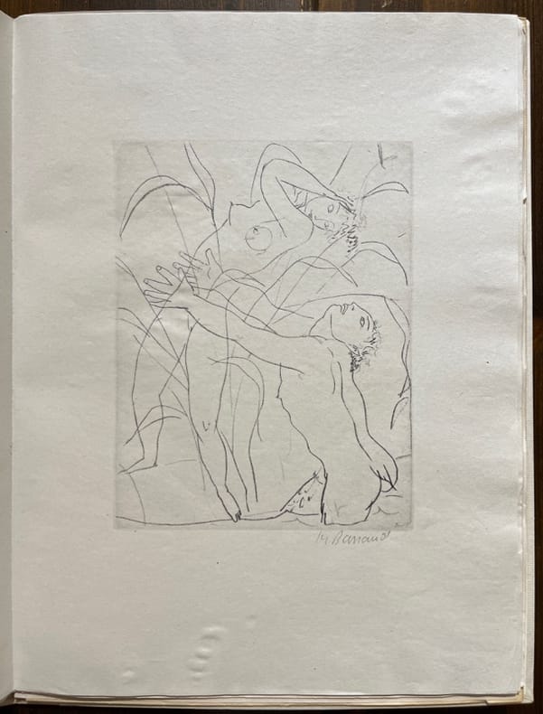 Illustré de 5 eaux-fortes au vernis mou de Maurice Barraud, tirées par Reynold Disteli. L'artiste les a toutes signées. Tiré à 153 exemplaires + 25 hors commerce. Celui-ci un des 23 sur Chine, enrichi d'un grand dessin original au crayon de Maurice Barraud, signé. Élégante publication à la typographie en deux couleurs, réalisée sur les presses du Maître imprimeur Albert Kundig, à Genève.Edition bilingue, traduction allemande par Ewin Maria Landau, qui a apposé sa signature à la justification. IL est amusant de noter que dans le bulletin de souscription - qui nous livrons avec cet exemplaire de tête, il est mentionné la possibilité d'obtenir des exemplaires sans le texte en allemand. Cette mention ayant été très méticuleusement biffée, il semble que l'éditeur n'ai finalement proposé ce choix aux amateurs. On peut encore ajouté que les exemplaire sur Chine sont bien plus mince que les exemplaire sur Guarro Molivell. Bel exemplaire (malgré la couverture qui est légèrement bruni, comme tout les exemplaires), peu commun sur Chine, Gindrat, Or ange, 035 déclare n'en avoir jamais vu sur Chine.