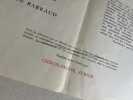Rombaldi Paris, Rombaldi, 1943. In-4 en feuillets sous couvertures illustrées rempliées, et double étui demi parchemin ivoire . DEBUSSY Claude: Prélude à l'après midi d'un faune (reproduction en fac-similé du manuscrit musical). MALLARME Stéphane : Un faune. MALLARME Stéphane : L'après midi d'un faune. CHARPENTIER Henri : Gloses. 72 lithographies originales en noir de René DEMEURISSE. Edition originale de ces poèmes qui font suite à l'après-midi d'un faune.Tirage limité numéroté à 220 exemplaires, celui ci n° 194 sur vélin pur chiffon à la forme des papeteries de Lana. L'impression des lithographies a été exécutée sur presse à bras par Mourlot frères. CARTERET : Tome 2 page 251. Bel exemplaire.