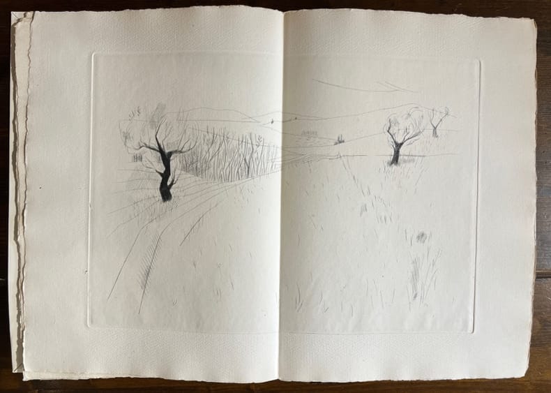 Illustré par Thierry Vernet de 8 gravures originales au burin, en noir. Édition originale, signée par l'auteur à la justification) et tirée à 50 exemplaires numérotés (40) sur Auvergne chiffon, unique papier. Ces gravures furent éditées une année avant le grand départ de Thierry Vernet et Nicolas Bouvier pour leur périple vers l'Afghanistan. Envoi autographe de l'auteur au faux-titre.