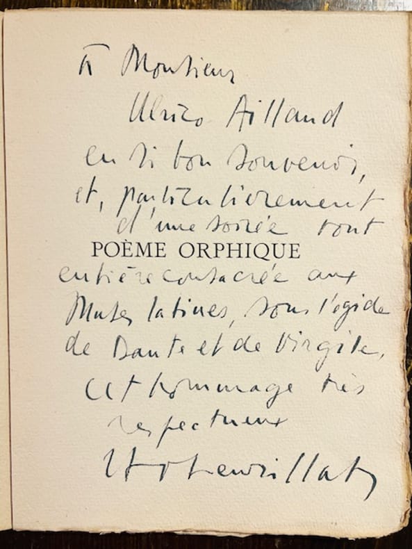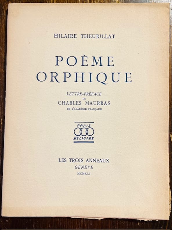 Édition originale tirée à 500 exemplaires numérotés (165) sur papier d'Auvergne à la forme, achevé d'imprimer "le vingt deuxième jour du mois de juin MCMXLI, Monsieur le maréchal Pétain étant le chef de l'état français"... Le poème est précédé d'une lettre-préface de Charles Maurras. Envoi autographe de l'auteur "à Monsieur Ulrico Aillaud en si bon souvenir, et, particulièrement d'une soirée tout entière consacrée aux muses latines, sous l'égide de Dante et de Virgile, cet hommage très respectueux. H. Theurillat". Couverture ombragée.