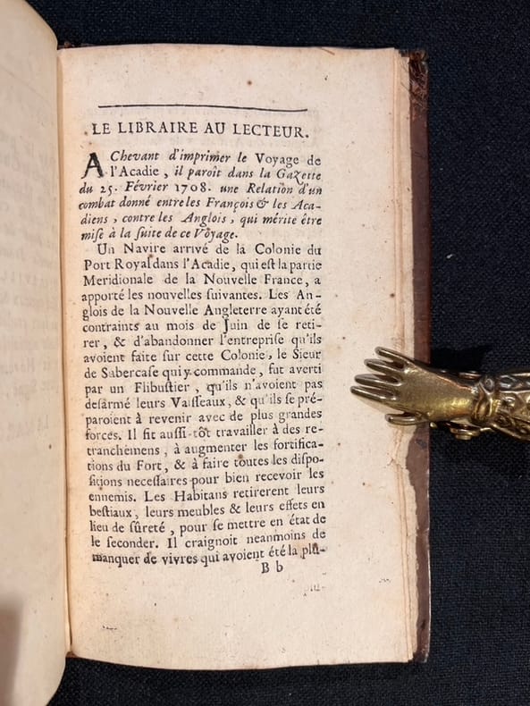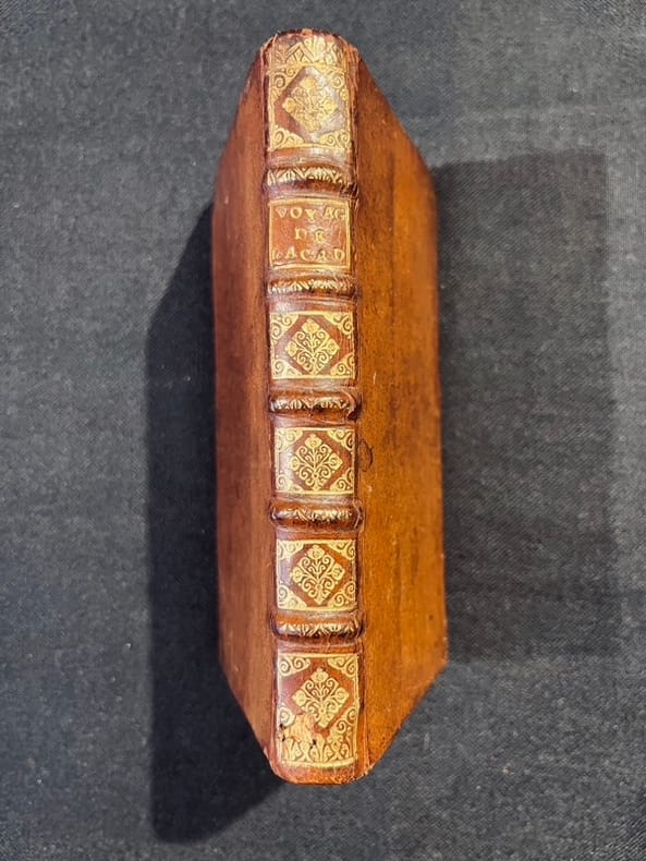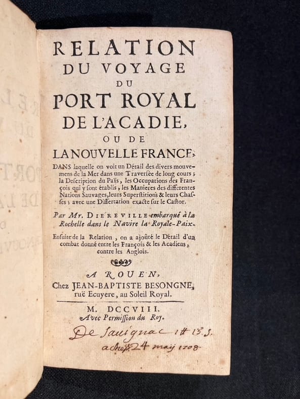 Édition originale rare. "Dièreville part de La Rochelle le 20 août 1699, sur la Royalle Paix, en qualité de subrécargue, c’est-à-dire de commis nommé par l’armateur et préposé à la surveillance de la cargaison. Il arrive à Port-Royal (Annapolis Royal, N.-É.), le 13 octobre, après 54 jours de voyage. Il passe un an au pays en quête de renseignements sur la région et sur les populations française et amérindienne ; il herborise également. Le 6 octobre 1700, il s’embarque pour l’Europe et arrive à La Rochelle le 9 novembre. L’année suivante, le 21 décembre, il devient chirurgien de l’hospice de Pont-l’Évêque, poste qu’il occupe encore le 10 avril 1711. Les plantes qu'il rapporte servent à leur description par Joseph Pitton de Tournefort en 1706. Ce dernier nomme en fait le genre Diervilla en son honneur. Michel Bégon [conseiller du roi, à qui l'ouvrage est dédié] propose à Dièreville d'écrire un récit en vers sur son voyage en Acadie. Ses amis n'approuvent pas le texte et il finit par sacrifier 5000 vers pour n'en garder que 2529. Le texte est publié à Rouen en 1708 sous le titre Relation du voyage du Port Royal de l’Acadie, ou de la Nouvelle France.L’auteur décrit par le menu la vie à bord, sans oublier le mousse que l’on fouette pour calmer le vent et le naufrage d’une partie de la cargaison. Il s’intéresse particulièrement à la faune et raconte ses chasses et pêches, la poudrerie de l’hiver canadien (qu’il nomme foudrille), les procédés de fabrication de la bière d’épinette et du sucre d’érable ; il décrit le pays des aboiteaux, les mœurs des Indiens (et notamment la façon de ranimer les noyés au moyen de lavements de fumée de tabac), la cuisine des Amérindiens, des Acadiens et des navigateurs. Les souvenirs culinaires émeuvent ce fin gourmet et l’espace qu’il leur consacre fait de son récit la première œuvre importante de la littérature gastronomique au Canada. La relation, très bien accueillie à l’époque, fait l’objet d’une longue analyse bibliographique dans le Journal des Sçavans en 1708. Son succès de librairie repose sur l’engouement d’un public avide d’exotisme." Jacques Rousseau, article Diéreville, in Dictionnaire biographique du Canada en ligne. Ancienne signature sur la page de titre: "De Savignac acheté 24 maÿ 1708"Un coin frotté, petit manque de peau au bas du dos, minime choc (- de 5mm.) dans la gouttière des 8 derniers feuillets. Chadenat, 3196; Sabin 20128.