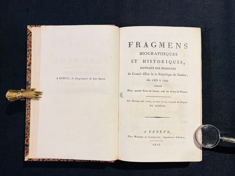 Illustrés de 97 portraits gravés, dont un en frontispice par Jean Alexandre Grand. Quelques emplacements, réservés aux portraits, sont restés vierges, l'éditeur expliquant que ce sont des portraits qu'il n'a su retrouver. Édition originale. A partir de 1409, la source principale de l'histoire de Genève est le Registre du Conseil. Les Fragmens biographiques et historiques sont établis d'après les registres de Jacques Flournois et couvrent tout l'Ancien Régime. Geisendorf 4146; Burgy, Les Sources.., n°199. !!! !!! Du 3 octobre au 24 octobre il n'y aura pas d'expédition de colis: le libraire est en voyage. La librairie reste ouverte et nous répondrons sporadiquement aux emails. Merci pour votre compréhension. ––> From 3 October to 24 October, there will be no parcel deliveries as the bookseller will be travelling. The bookshop will remain open and we will respond to emails sporadically. Thank you for your understanding.