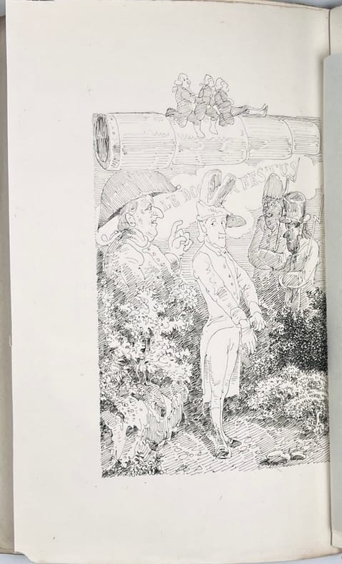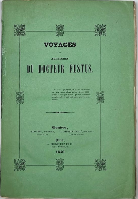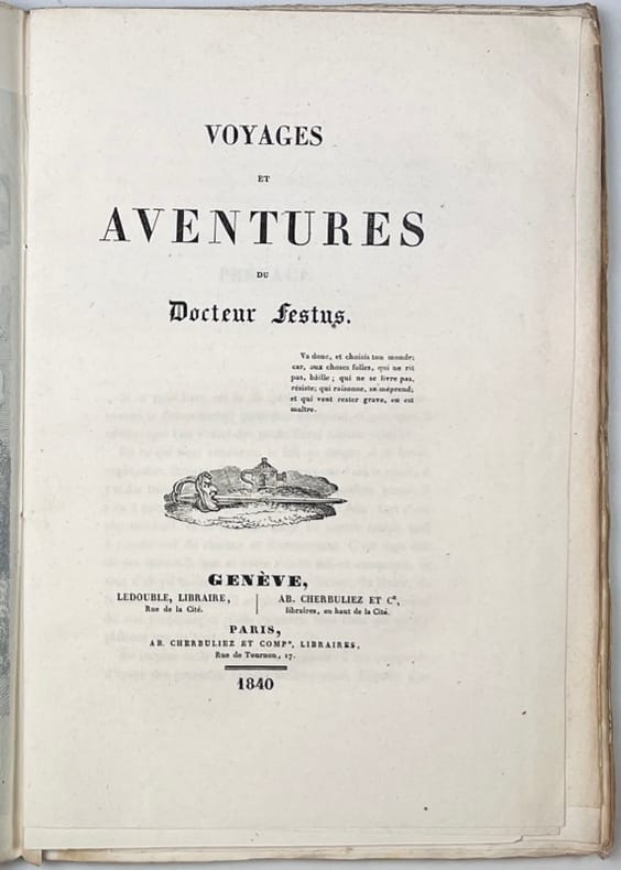 Illustré de 8 hors-texte de l'auteur: 7 dessins, dont un formant le frontispice et une carte géographique, tirés sur papier fort. Seconde édition que l'on a longtemps considérée comme la première, tant celle de 1833 est rare: pour preuve, on en connaît aujourd'hui deux exemplaires uniquement. "On sait que presque la totalité des exemplaires de l'édition de 1833 ne fut pas mise en circulation et ainsi l'édition de 1840 a été réalisée avec les feuillets restants de l'édition de 1833, avec de très nombreuses variantes. Les cahiers 6, 7, et 10 (dernier) ont été entièrement recomposés; la Préface, page V et VI est différente de celle de 1833 et plus importante". Maurice Bridel, in "Bibliothèque Théophile Bringolf" qui annonce un tirage à 400 exemplaires plus une trentaine sur papier fort. Notre exemplaire est bien complet du feuillet blanc qui compte pour les pages 31 et 32. Exemplaire très frais, hormis un dos légèrement et proprement restauré. Mirabaud p. 13; Lonchamp 3017; Suzannet, 15 et 15a.