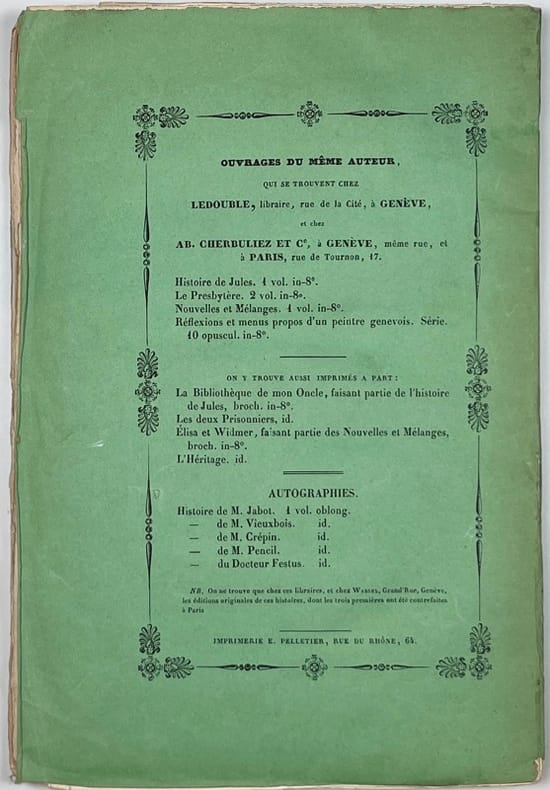 Genève, Ledouble; A. Cherbuliez et Cie, 1840. In-8 broché de VI et de [7] à la page 160, couvertures vertes.