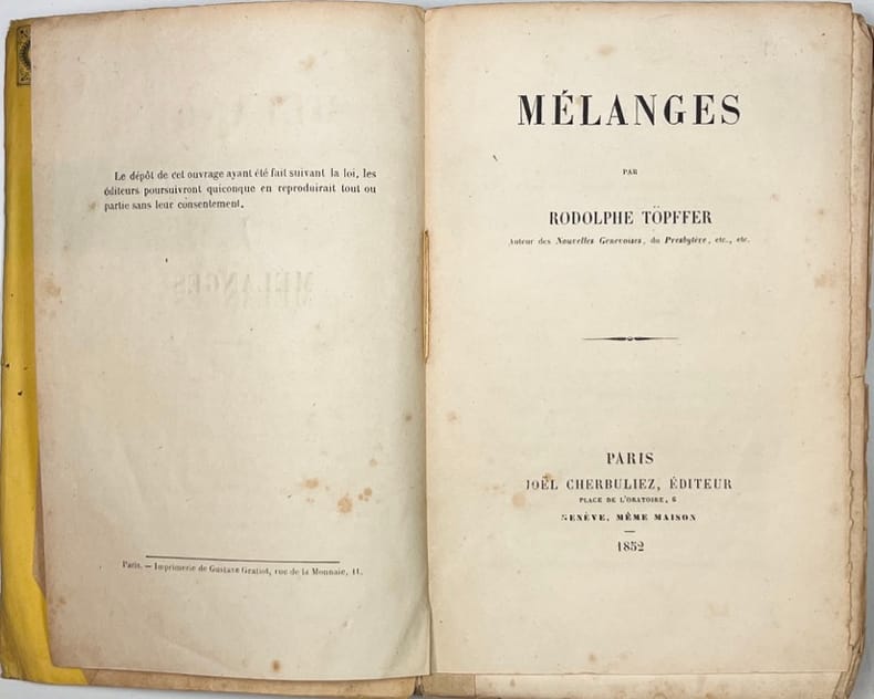 Genève, Éditions Albert Skira; éditions Pierre Cailler, 1942-1958. Collection complète en 26 volumes soit : Nouvelles I : 3 vol. br. in-4. Caricatures : 11 volumes brochés in-8 à l'italienne. Le presbytère : 2 vol. br. in-4. Rosa et Gertrude : 1 vol. br. in-4. Voyages en zigzag : 7 vol. br. in-8 à l'italienne. Mélanges sur les beaux-arts : 2 vol. br. in-4. Toute la série a en commun les couvertures rempliées et le fait d'être en très belle condition et non coupée.